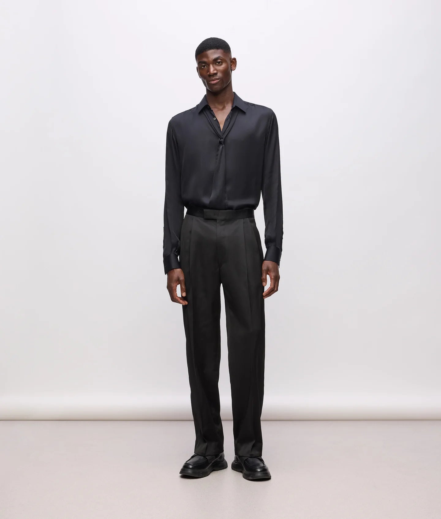 A refined balance of tailoring and modern ease, the KL Studio satin detail pants bring contemporary elegance to classic menswear codes. Cut in a subtle barrel-leg silhouette, these trousers are shaped with double front pleats that create a fluid drape and allow for effortless movement. The result is a relaxed yet polished profile that transitions seamlessly from formal settings to elevated everyday wear.