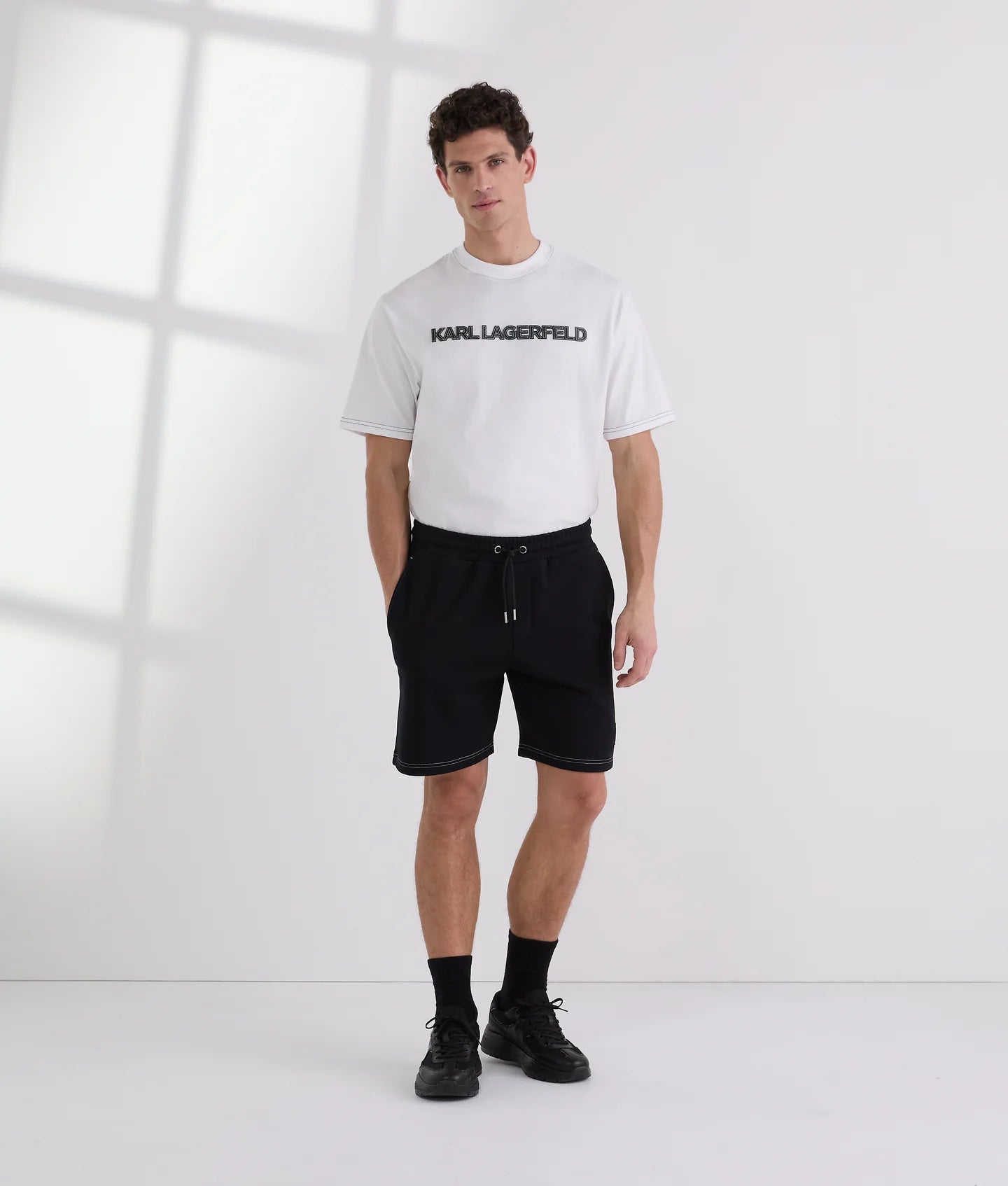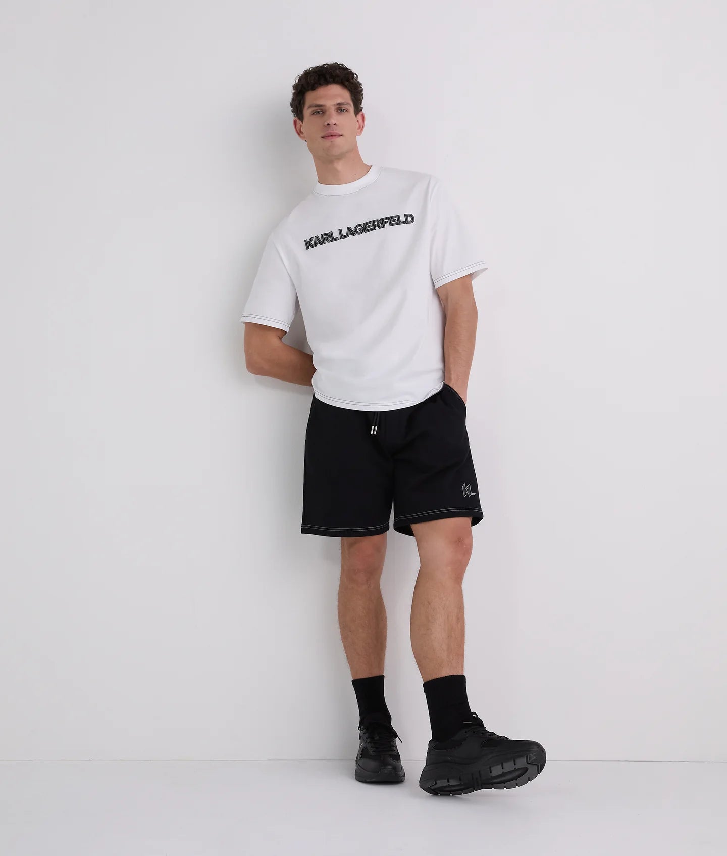 Signature contrast stitch detailing runs throughout the design, adding visual interest and a modern edge, complemented by the embroidered Karl Monogram motif at the lower left leg. These thoughtful touches make the shorts versatile enough to wear on laid-back days, casual outings, or paired with the coordinating hoodie for a cohesive, street-ready ensemble.