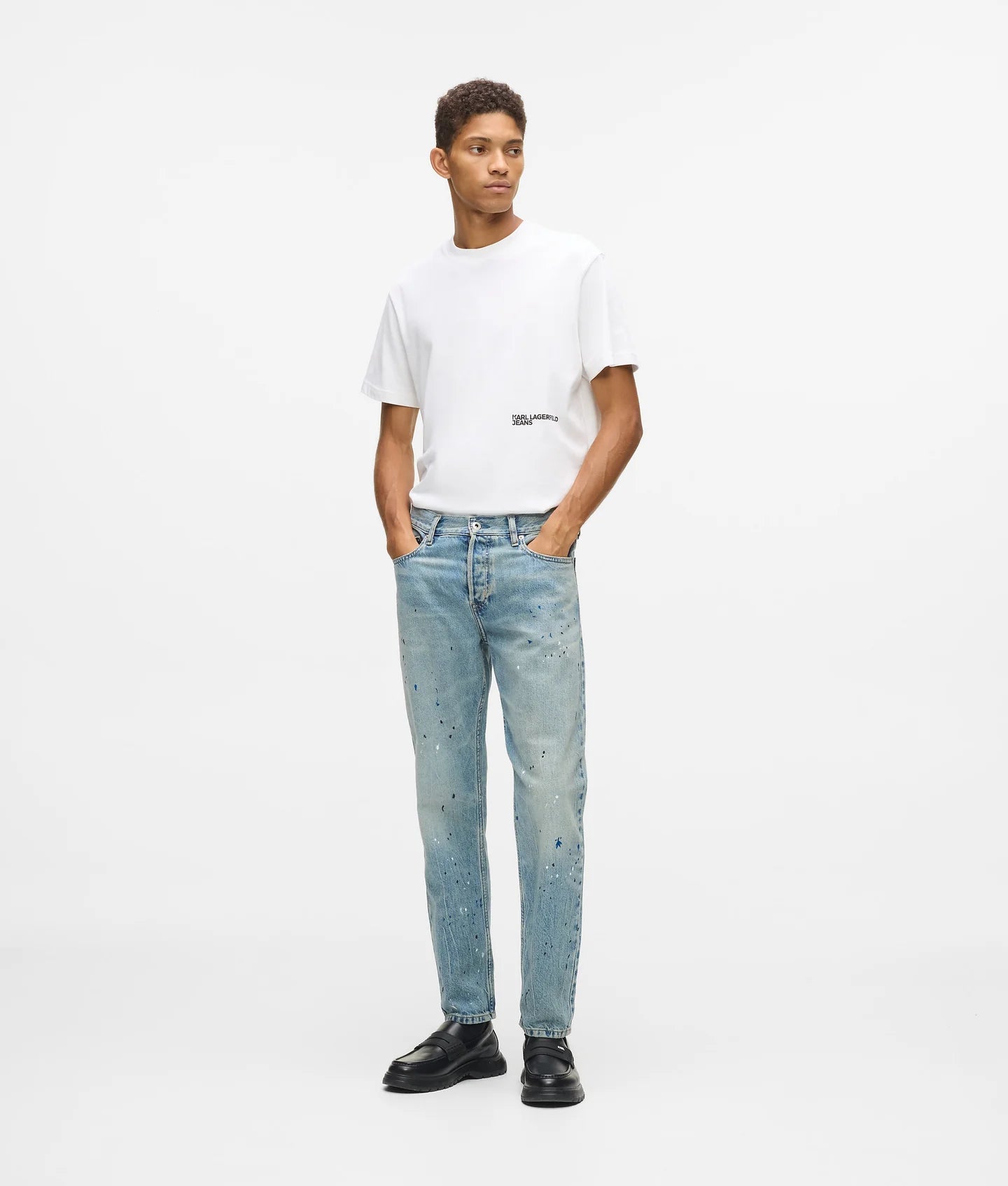 Artistic expression meets modern street style in the Paint Splatter Tapered Jeans from KARL LAGERFELD JEANS. Designed to make a bold statement, these jeans feature a streamlined tapered fit enhanced by paint splatter detailing down the legs, delivering a rebellious, creative edge to a classic denim silhouette.