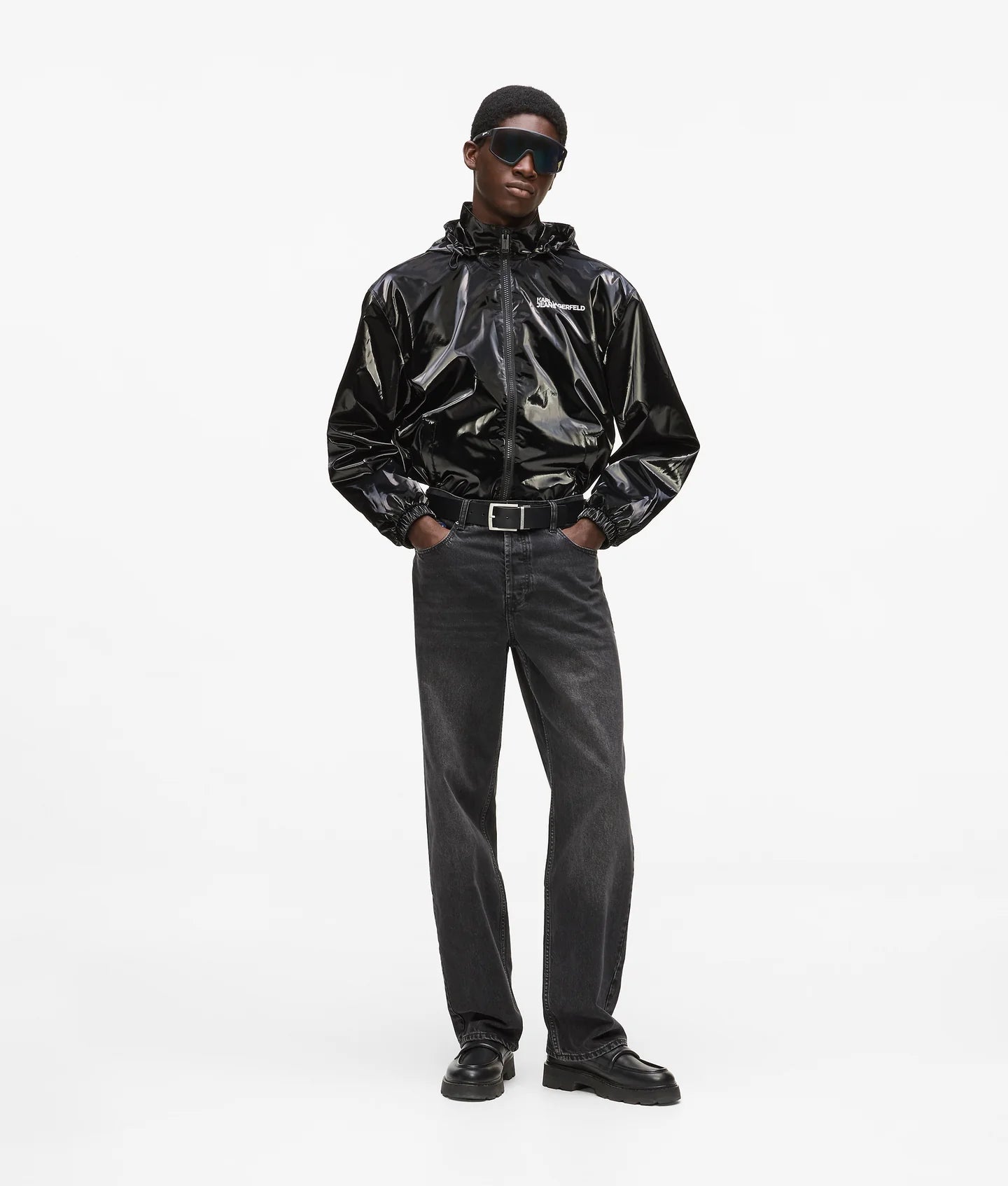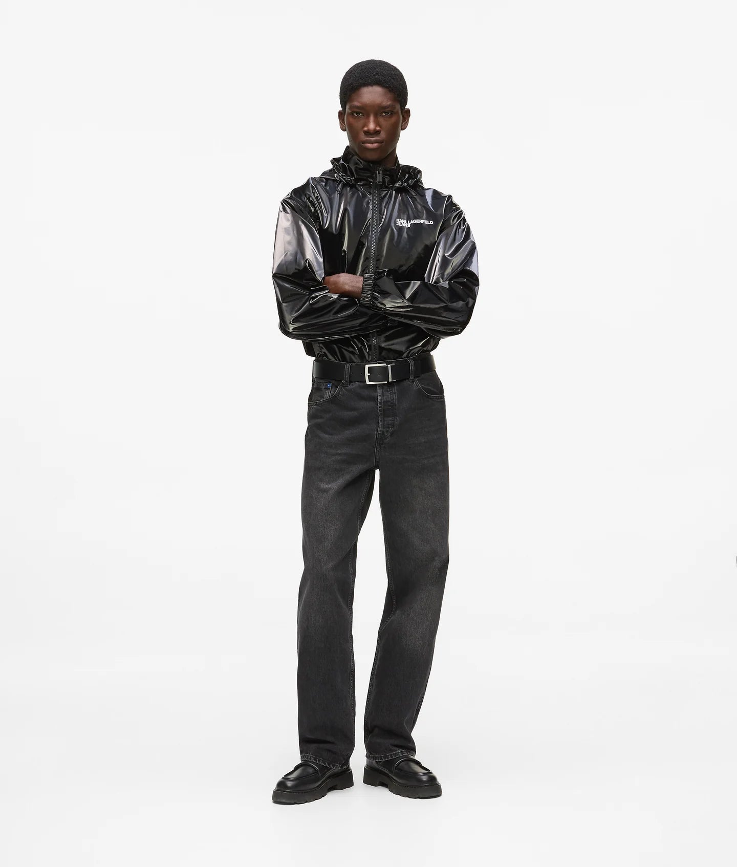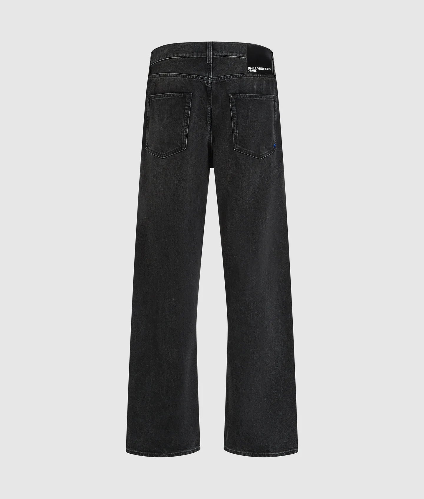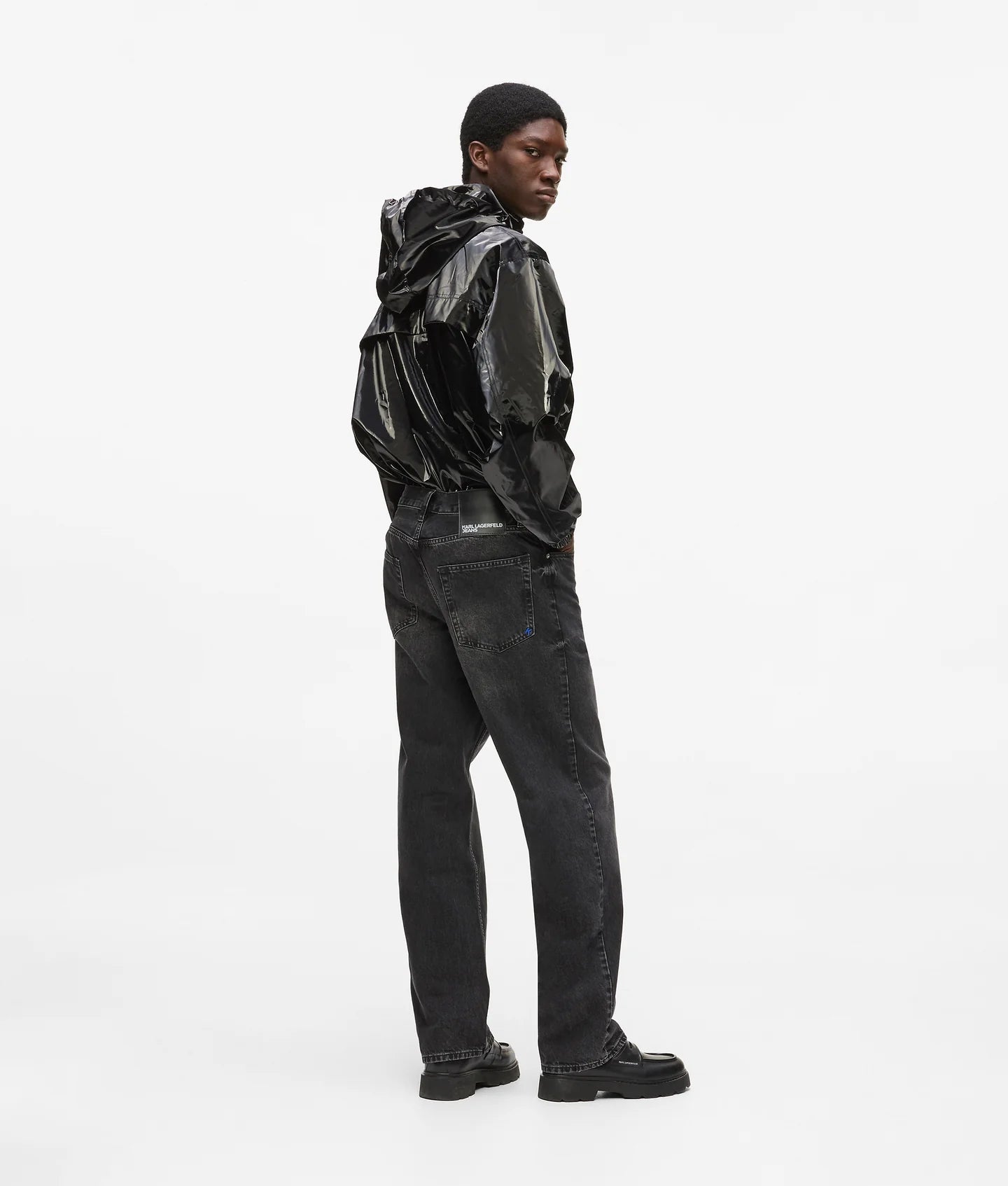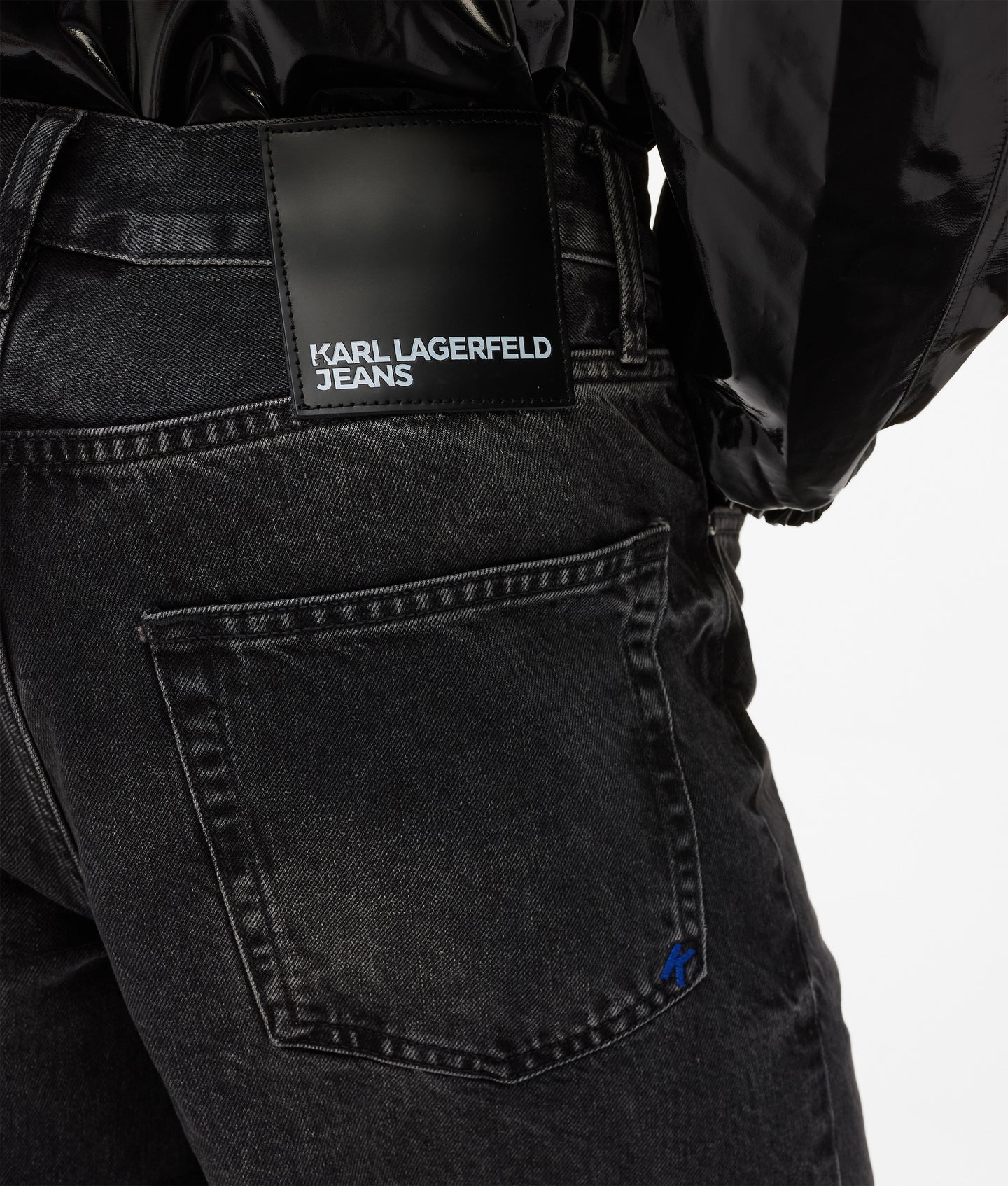 Subtle yet distinctive KARL LAGERFELD JEANS detailing completes the look. A branded shank button at the fly closure adds a refined finish, while the signature leather patch at the back waistband and blue K-initial embroidery at the back right pocket deliver understated brand identity.