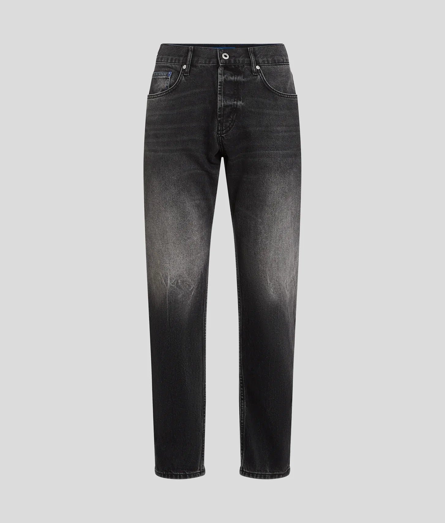 The tapered fit creates a clean, tailored profile that pairs effortlessly with sneakers, boots, or casual layers. A branded shank button and zip-fly fastening add premium detailing, while iconic touches such as the KARL LAGERFELD JEANS leather patch and K-initial embroidery on the back pocket elevate the design with signature flair.