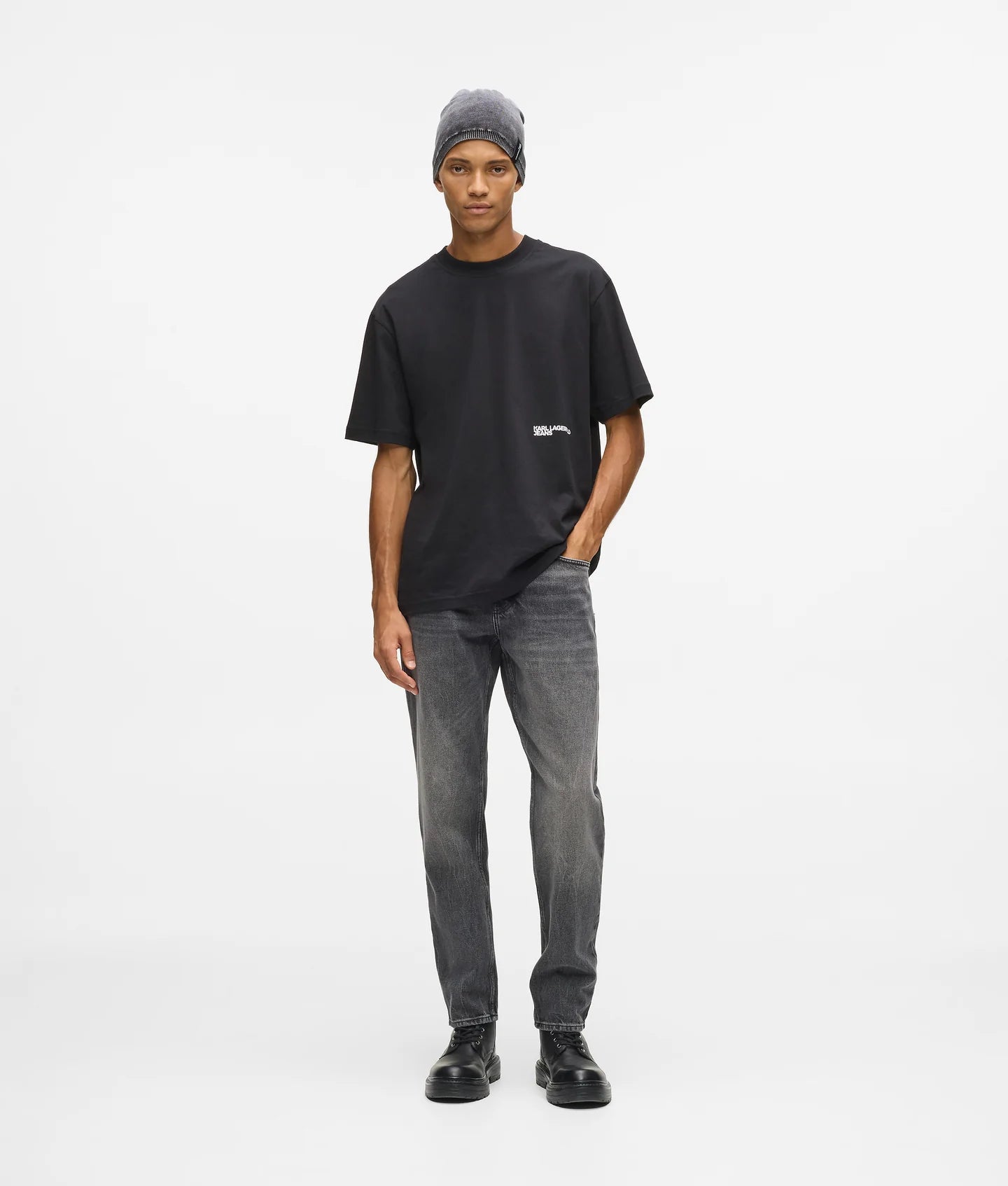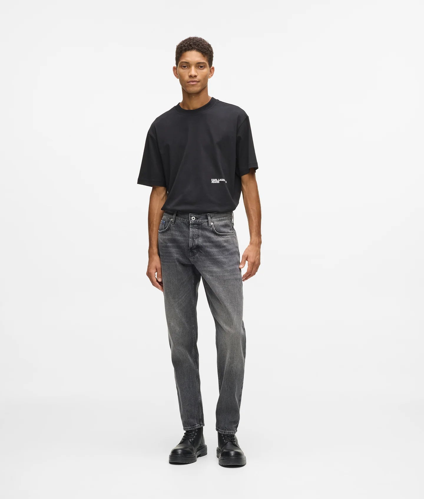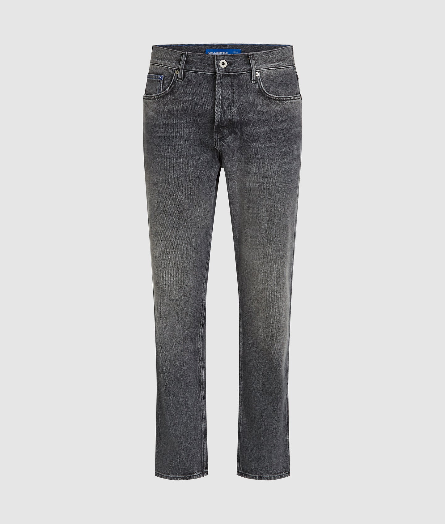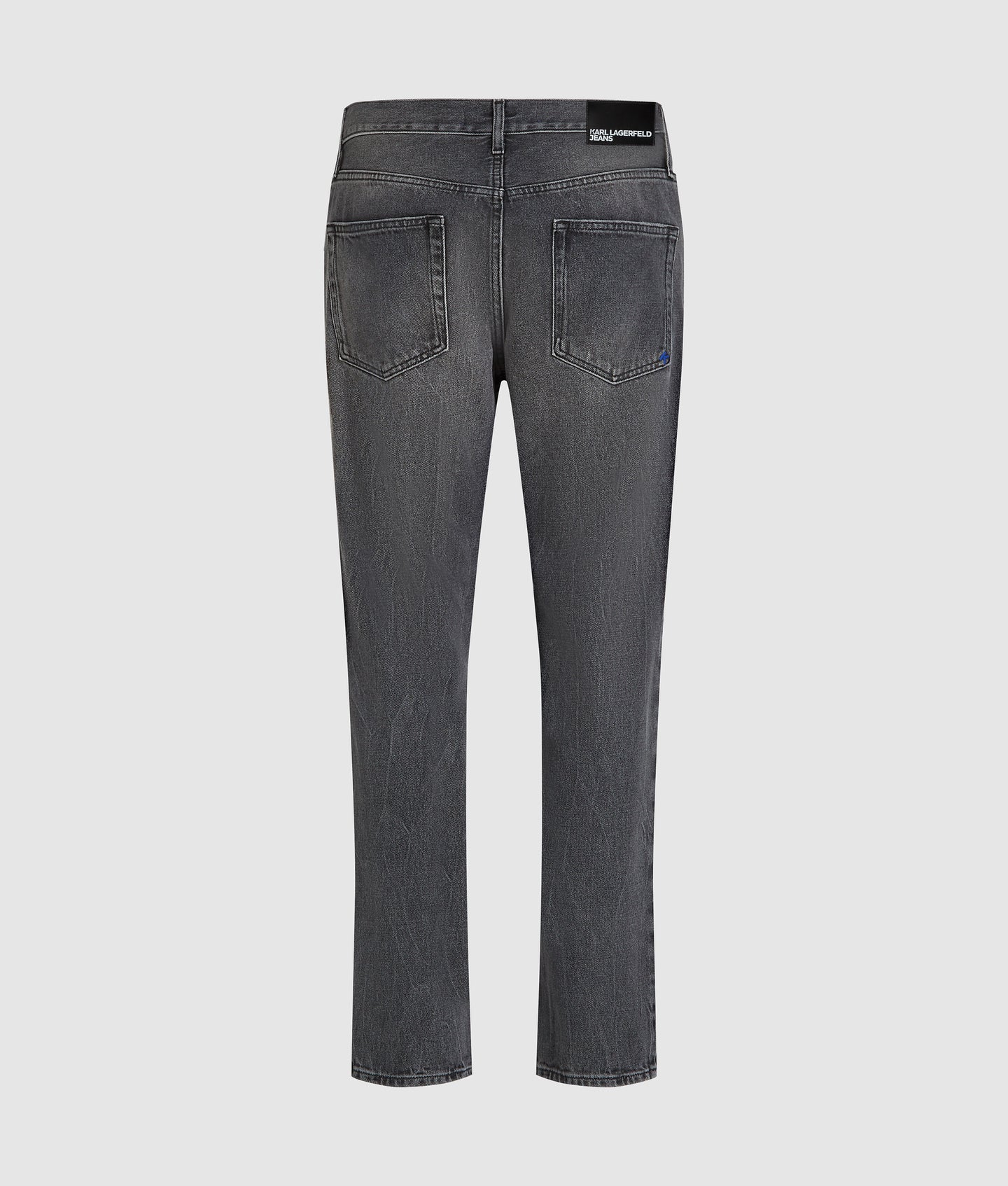 Signature details elevate the design, including a branded shank button at the fly closure, a KARL LAGERFELD JEANS leather patch at the back waistband, and blue K-initial embroidery at the back right pocket—refined touches that reflect the brand’s confident, contemporary aesthetic.