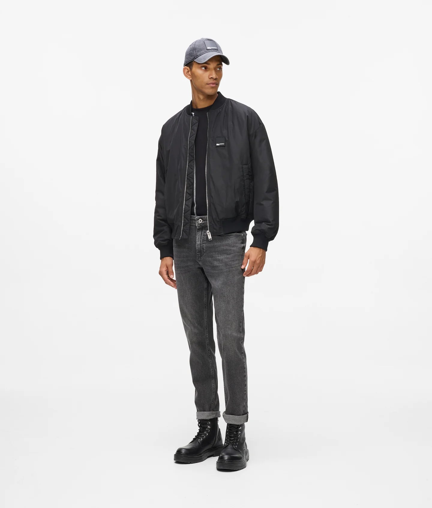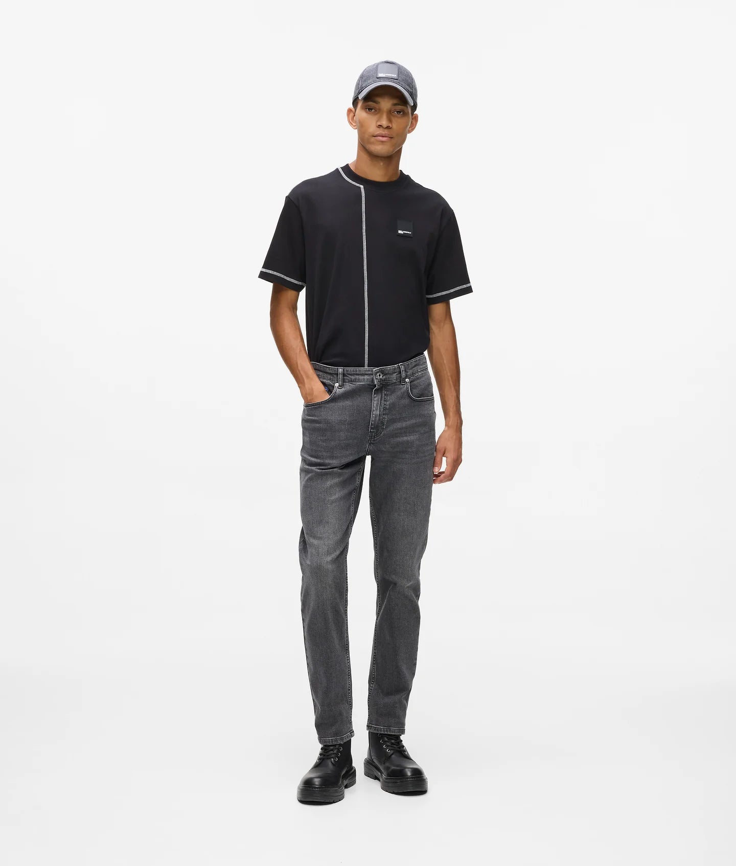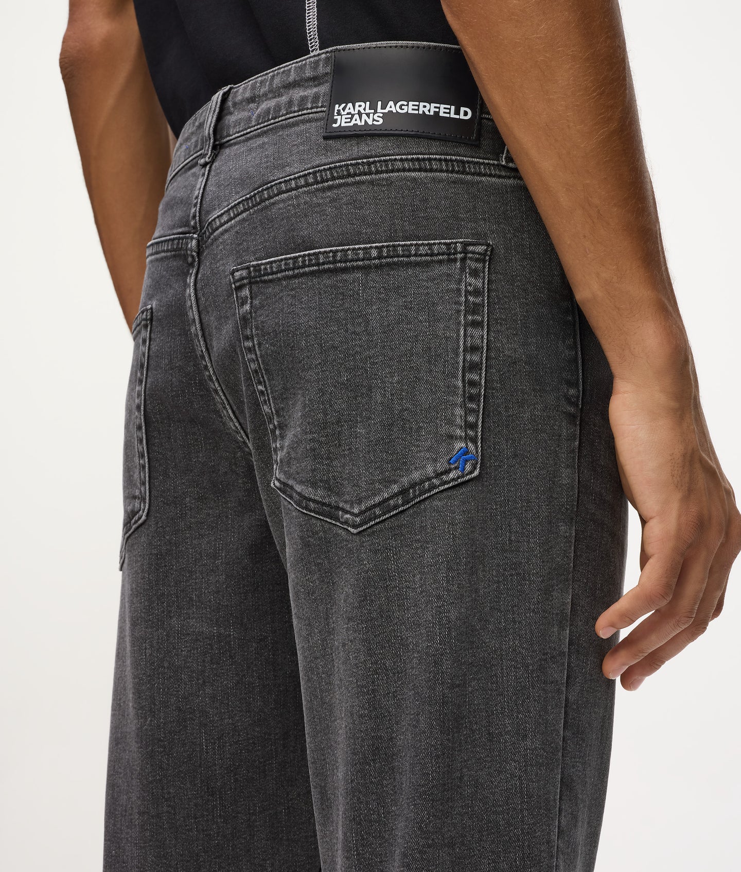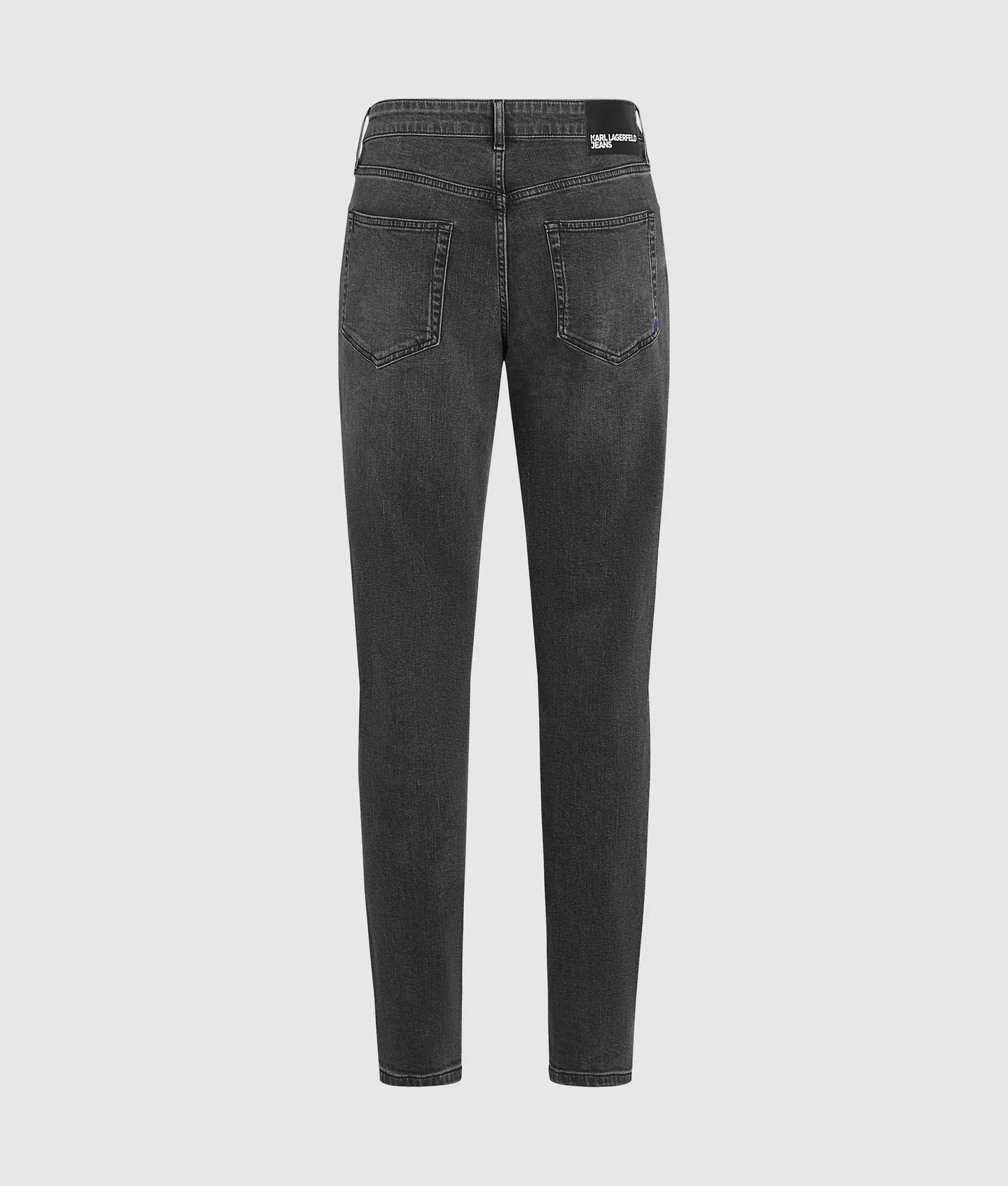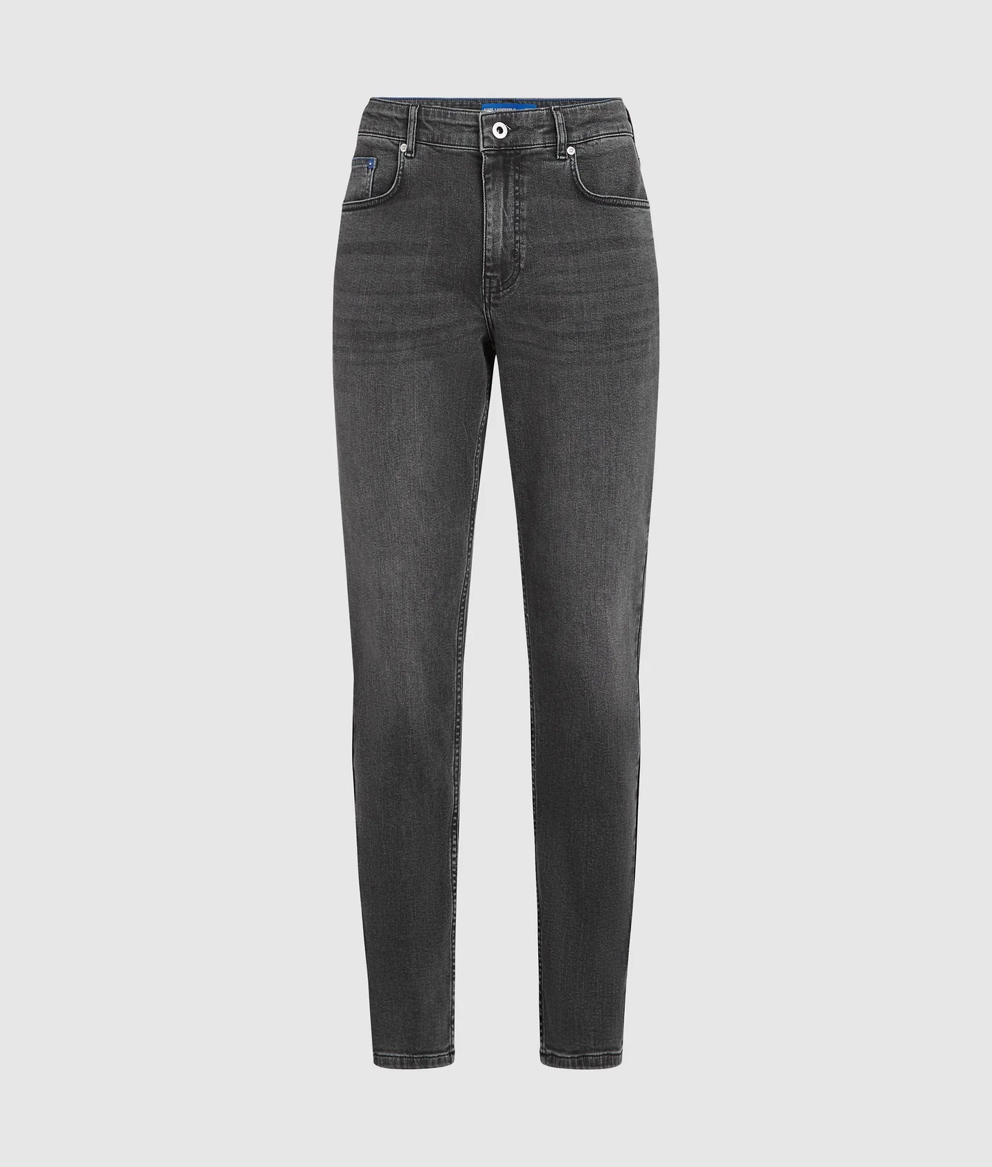 The washed finish gives the denim a versatile, lived-in look that transitions effortlessly from casual to polished styling. A branded shank button at the fly closure adds a refined designer touch, while signature details—such as the KARL LAGERFELD JEANS leather patch at the back waistband and blue K-initial embroidery at the back right pocket corner—anchor the design in iconic brand identity.