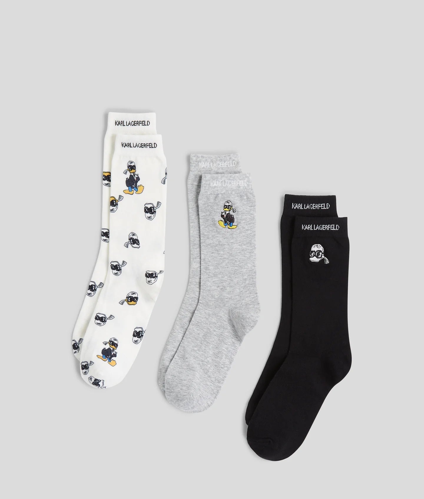 Step into a world of playful luxury with the Disney x Karl Lagerfeld Print Socks 3-Pack, a special-edition set that brings iconic design and fun together. These mid-length socks feature archival sketches of Disney’s Donald Duck, hand-drawn by Karl Lagerfeld in the early 2000s, blending whimsical charm with signature designer flair.