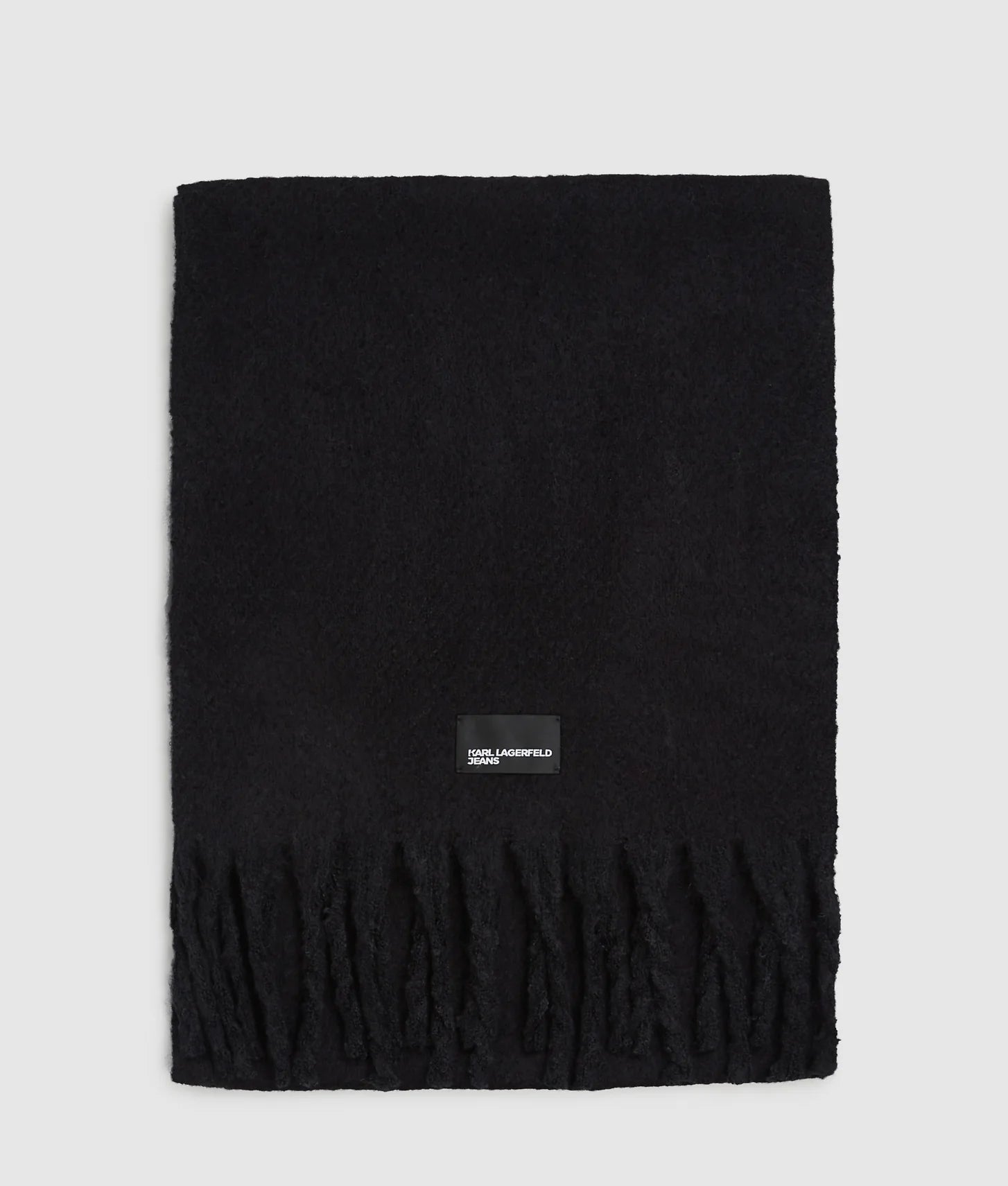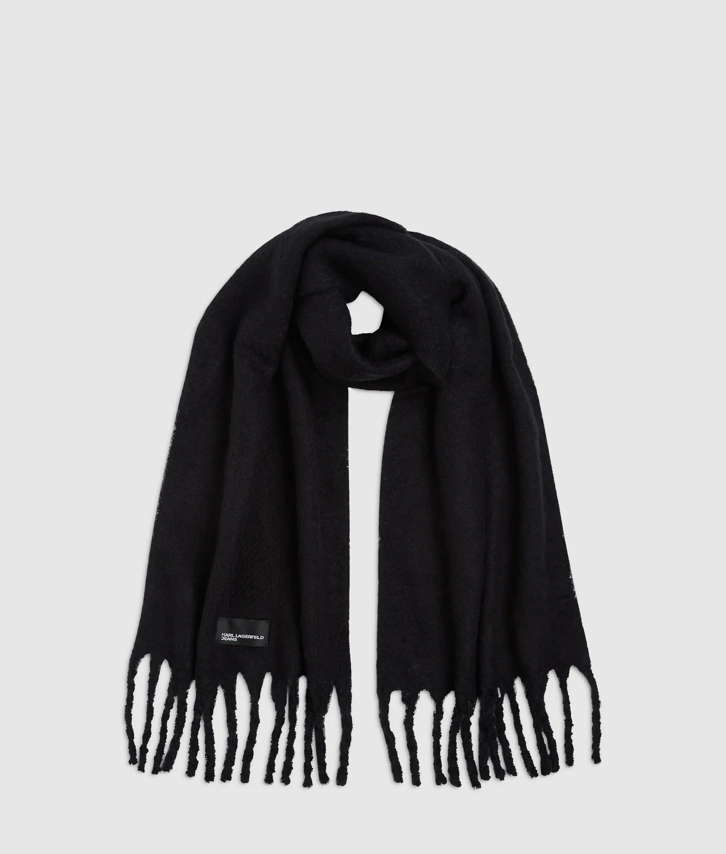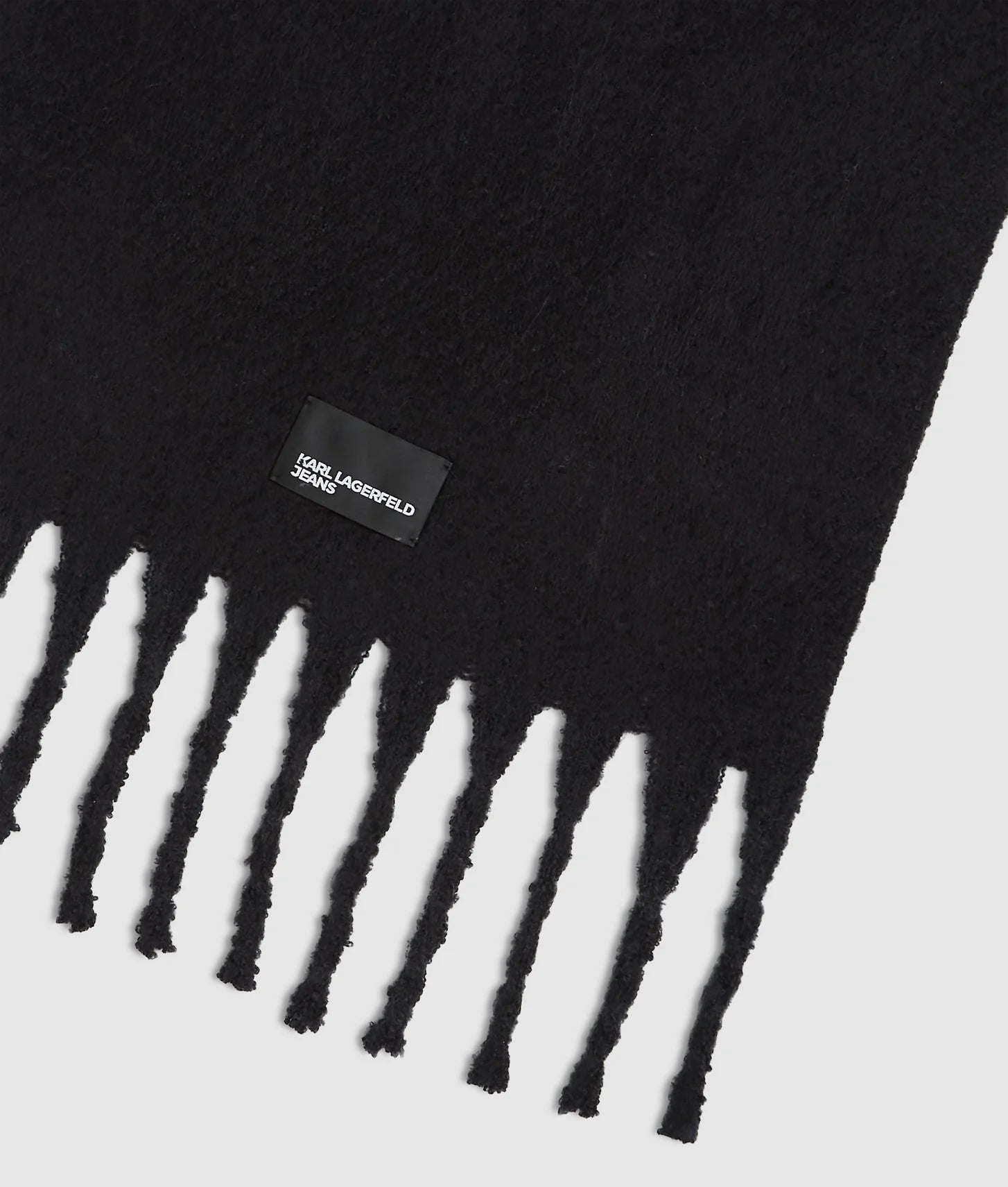 The long-length silhouette allows for versatile styling, whether draped loosely, wrapped multiple times, or tied in a chic knot. Classic fringe detailing at the ends adds movement and visual interest, enhancing its playful yet refined aesthetic. A subtle KARL LAGERFELD JEANS logo patch completes the design with a touch of signature branding, offering understated elegance.