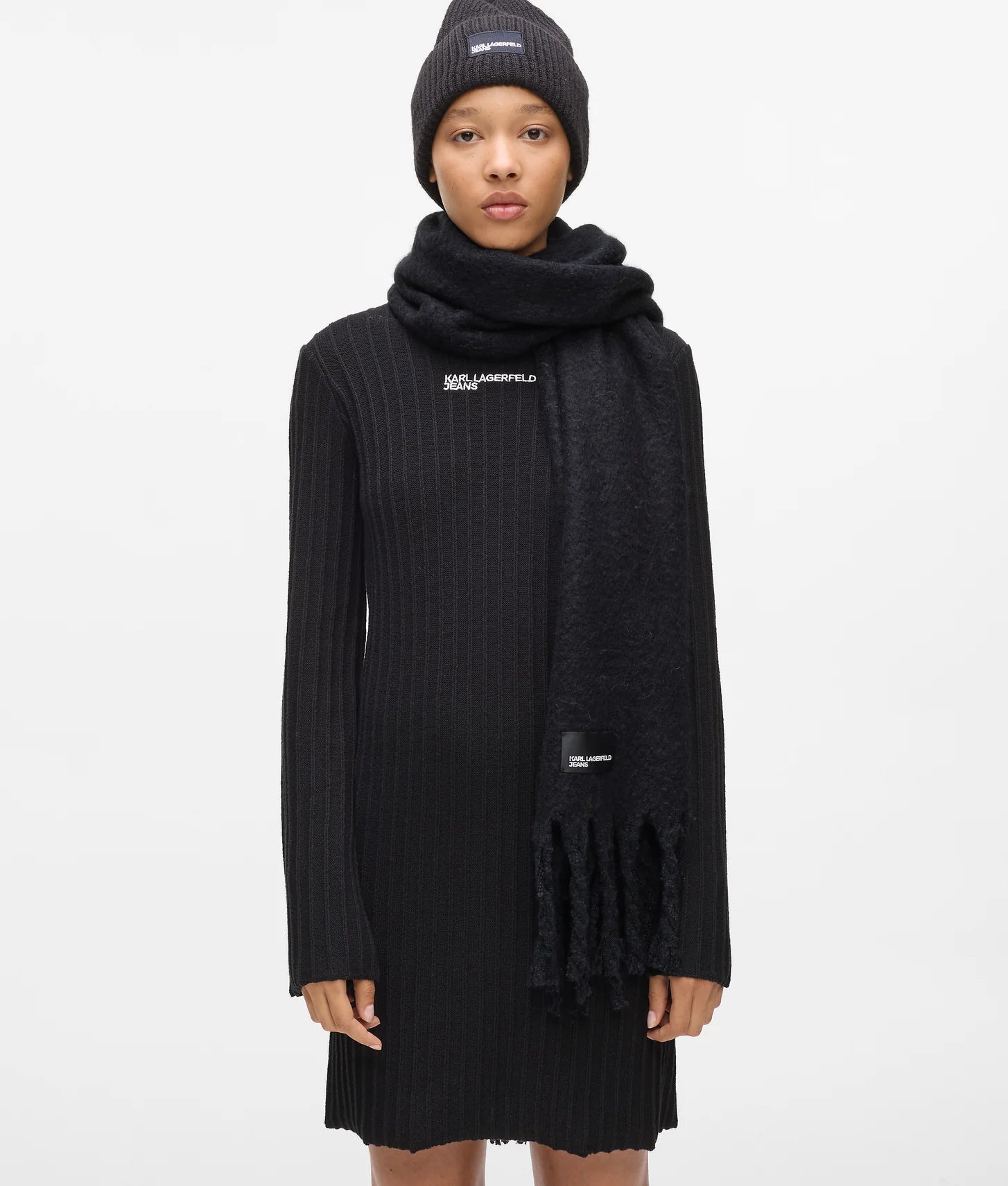 A playful and luxurious winter accessory that fuses cozy texture, versatile design, and signature KARL LAGERFELD JEANS detailing—perfect for adding warmth and style to any outfit.