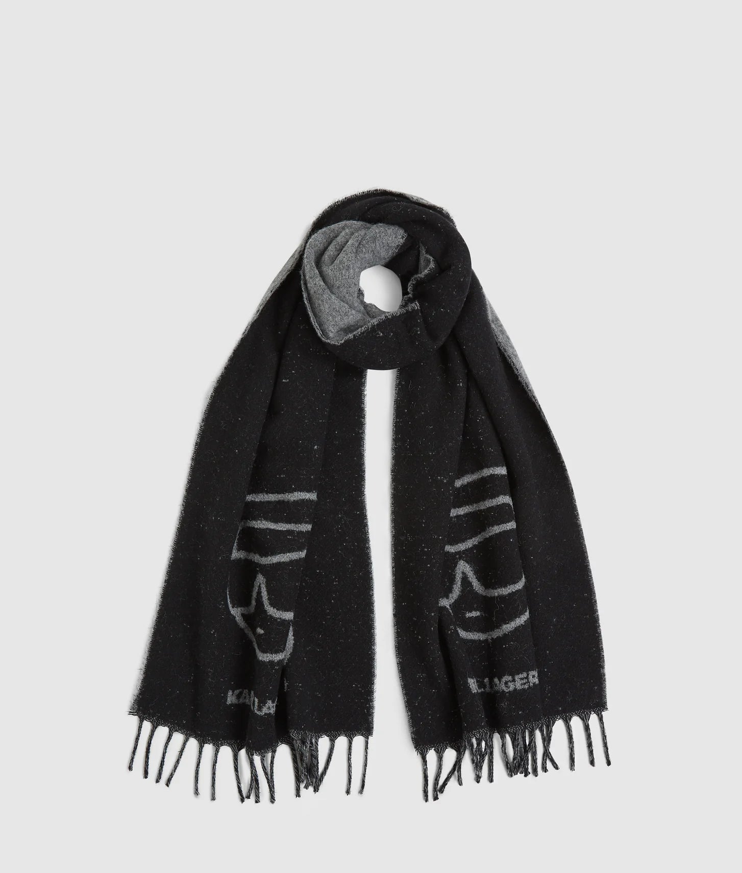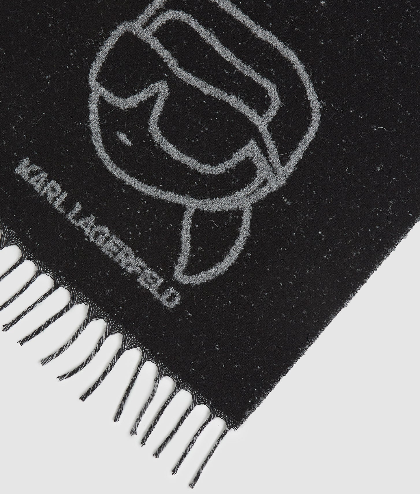 Bold jacquard Ikon Karl artwork runs through the design, adding a playful yet instantly recognizable touch, while fringe detailing at the ends brings classic scarf styling with a modern edge. Its generous length allows for versatile wear—drape it loosely over the shoulders, wrap it snugly around the neck, or style it over outerwear for maximum impact.