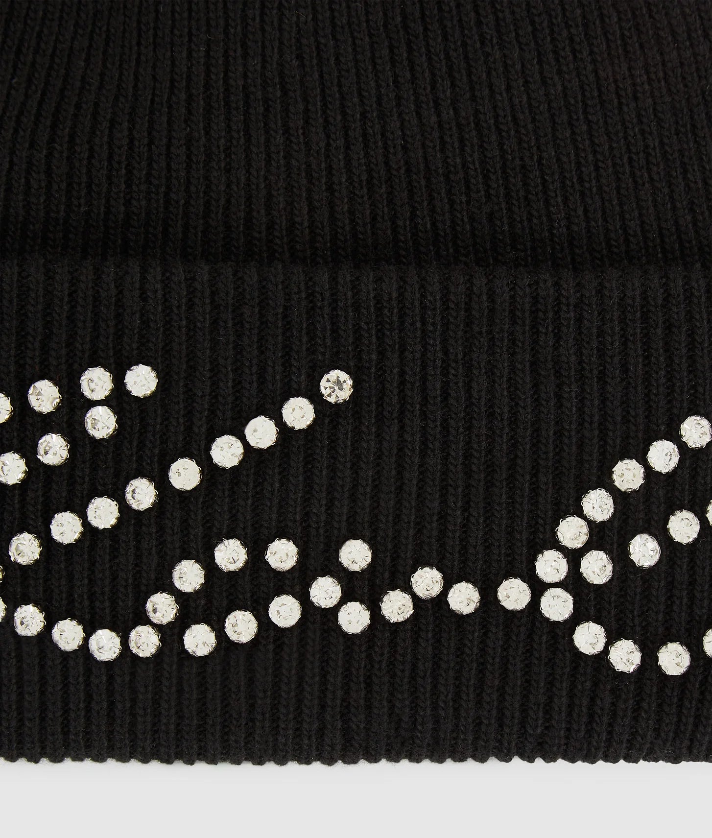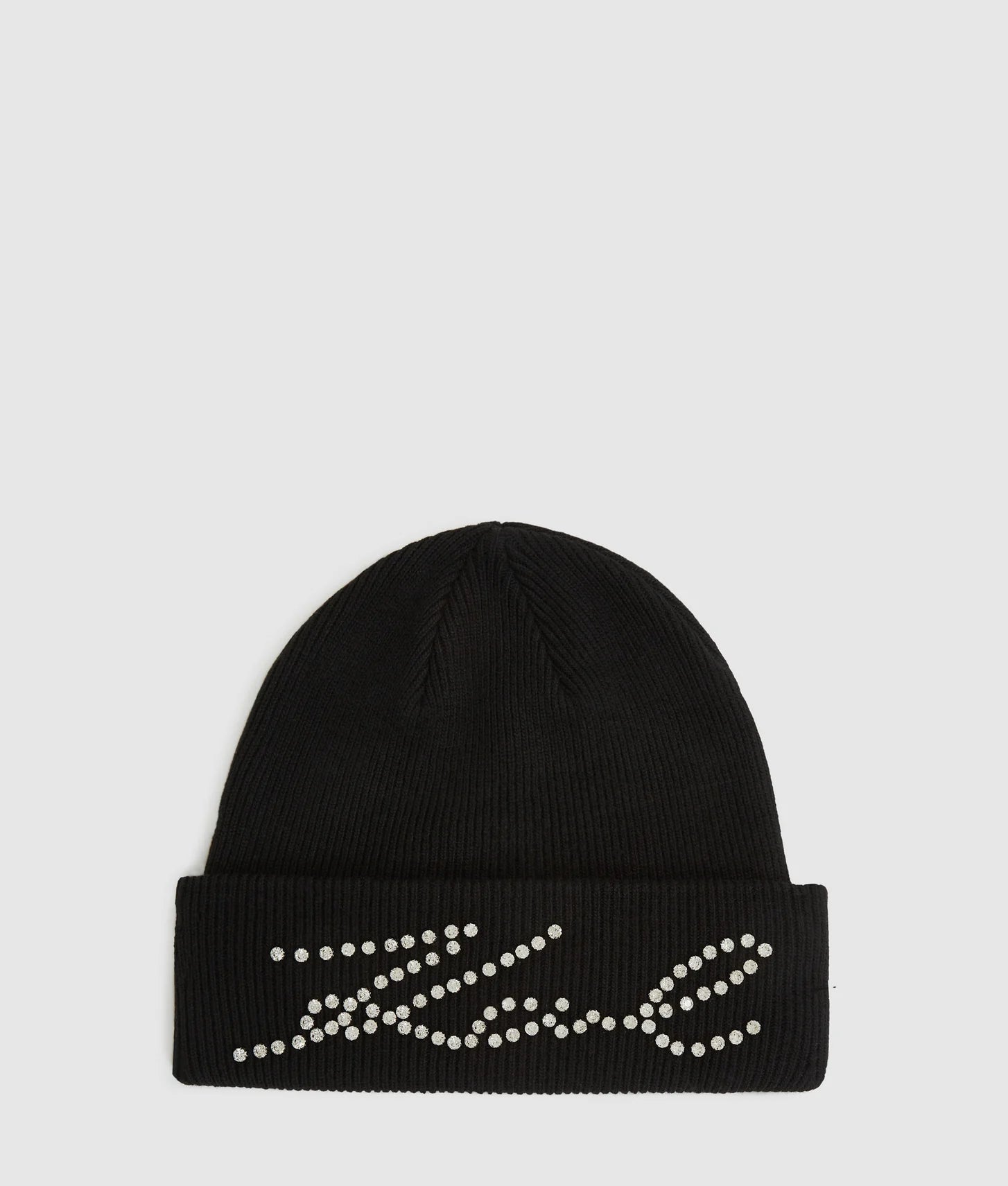 Featuring a folded brim, the beanie provides a classic winter silhouette with added warmth around the forehead and ears. The highlight of this design is the dazzling Signature rhinestone embellishment at the front, which adds a glamorous touch to any outfit while showcasing iconic KARL LAGERFELD branding. Its versatile style allows for effortless pairing with coats, jackets, scarves, and matching winter accessories.