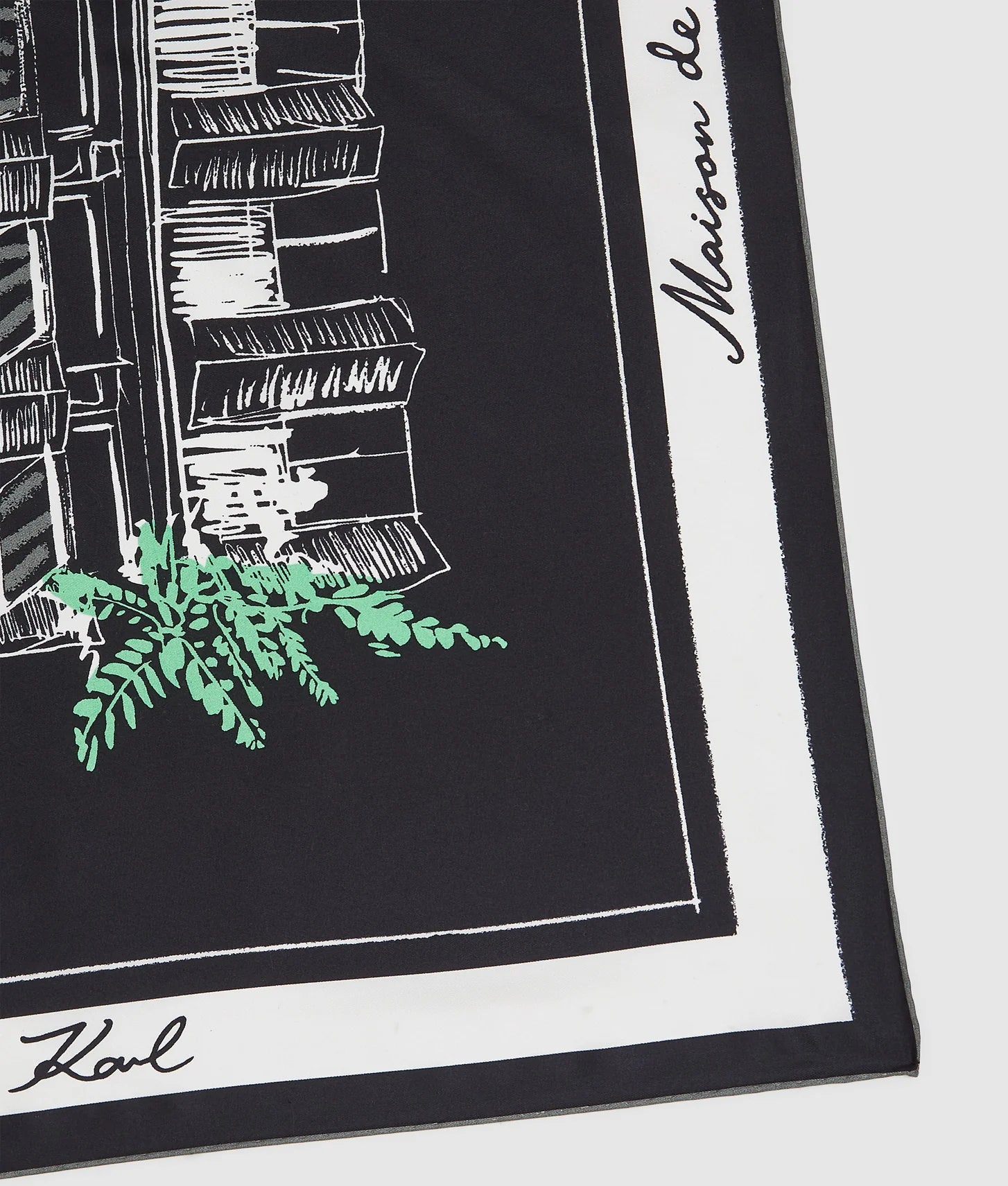 The scarf showcases illustrative Maison de Karl artwork, celebrating the brand’s creative heritage with a distinctive, fashion-forward aesthetic. A contrasting border featuring the Maison de Karl logo frames the design beautifully, adding definition and a signature finishing touch. The classic square shape allows for versatile styling—wear it around the neck, tie it to a handbag, style it as a headscarf, or drape it as a chic accent.