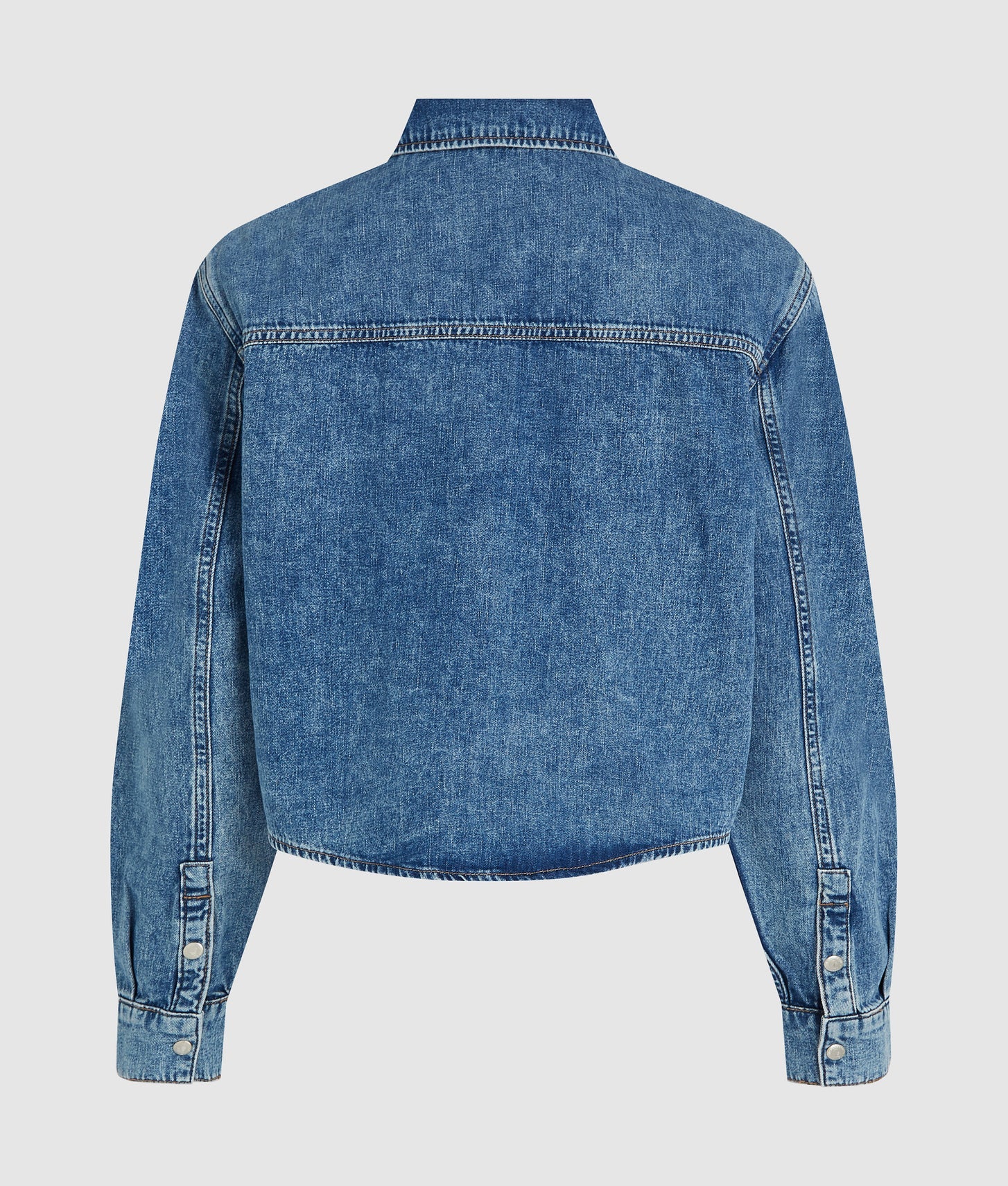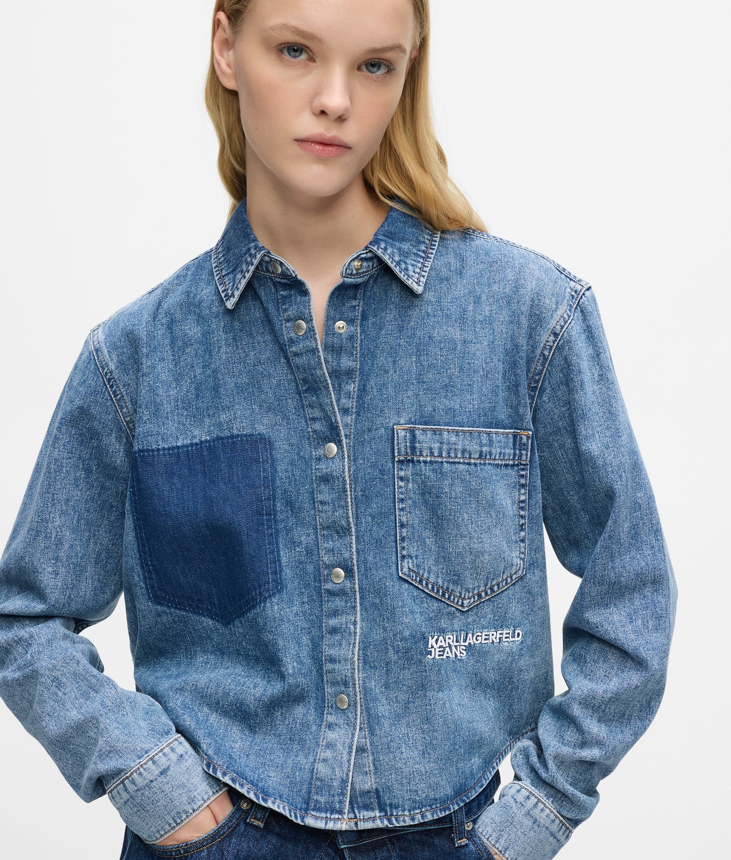 Branded snap buttons at the front and cuffs add a distinctive, utilitarian touch, reinforcing the shirt’s bold character. Thoughtful design details elevate the look, including a functional left chest pocket paired with a deliberately removed right pocket for an asymmetrical, fashion-forward finish. Subtle KARL LAGERFELD JEANS logo embroidery beneath the pocket completes the design with signature branding.