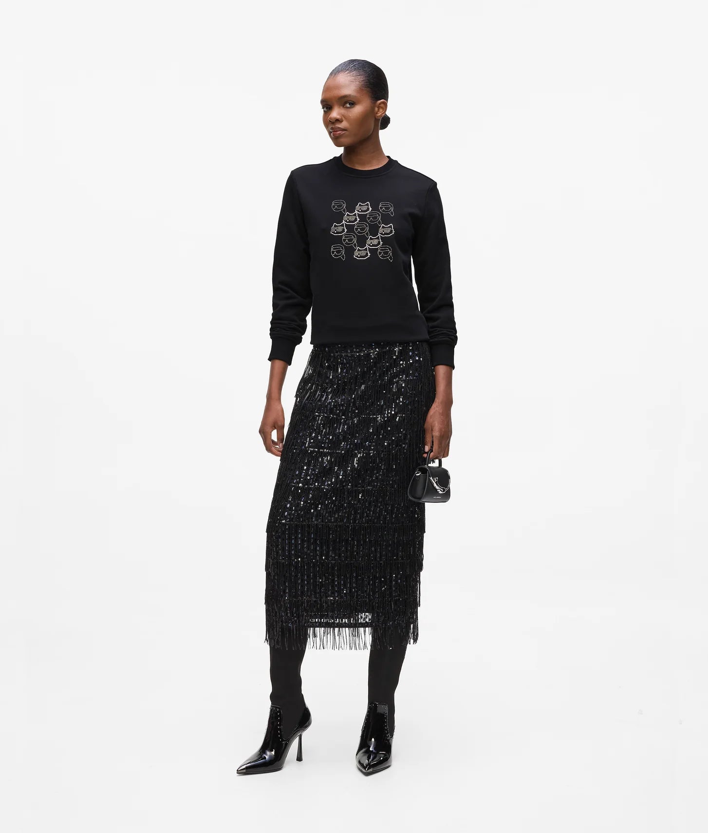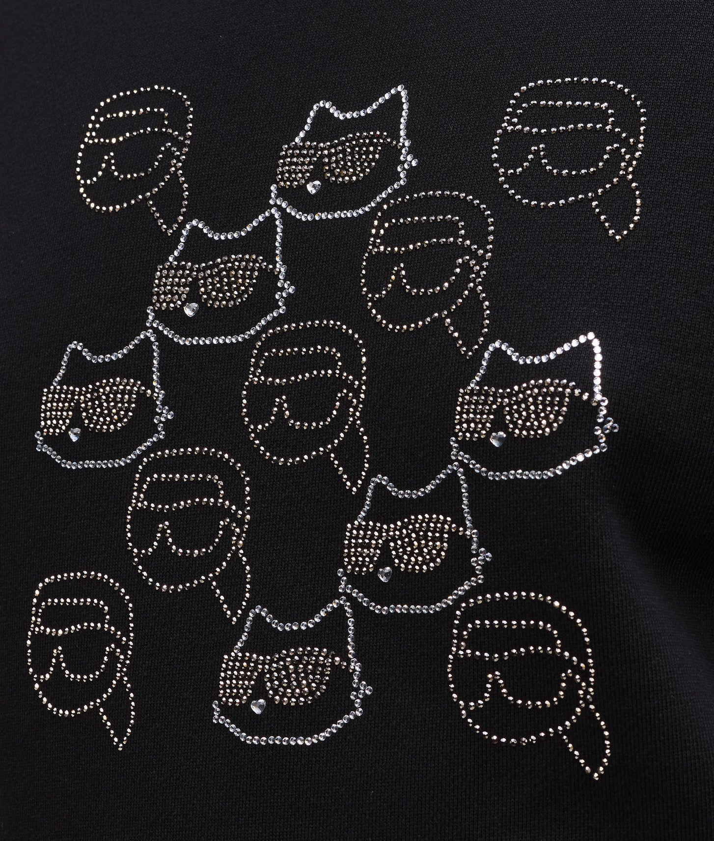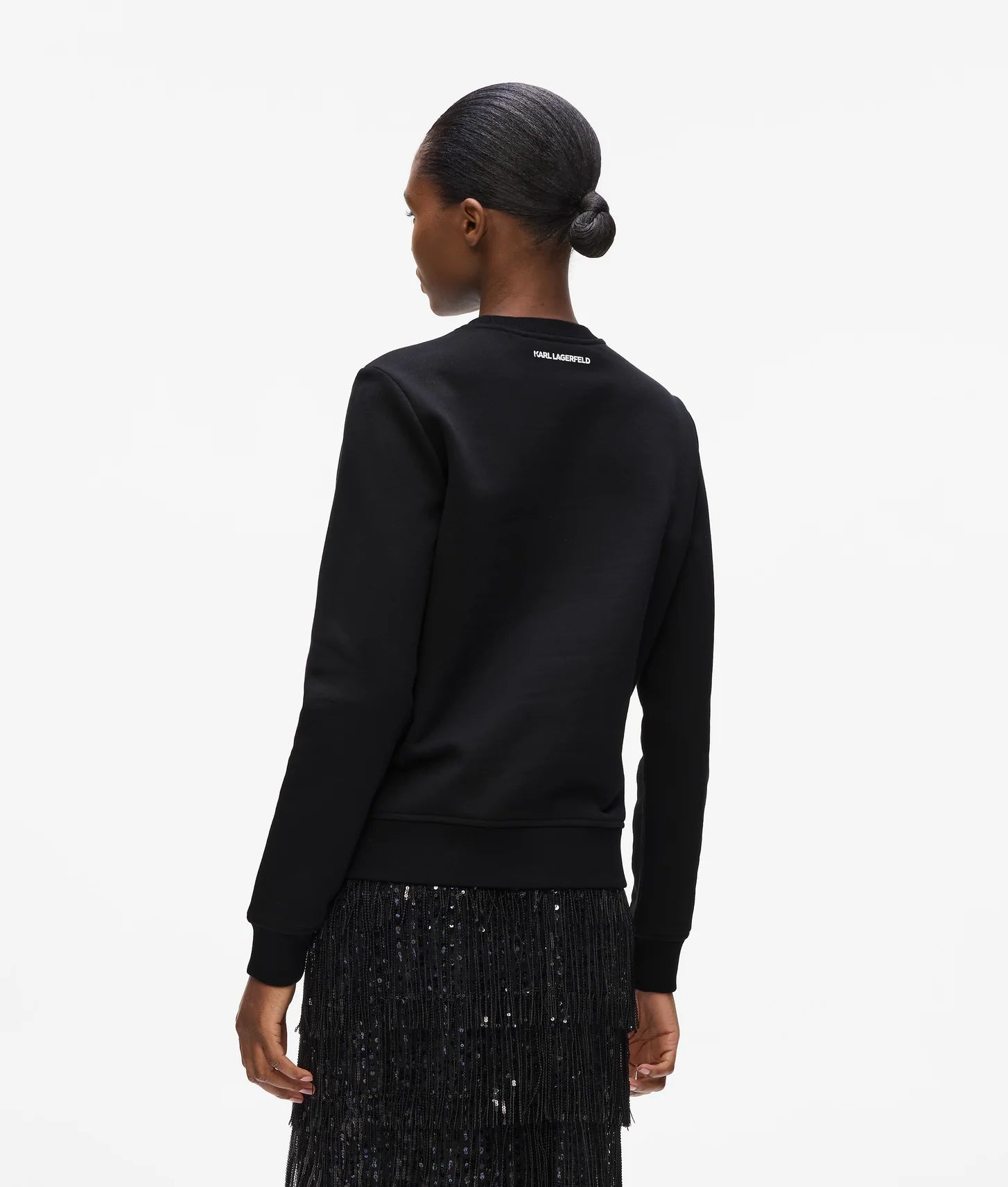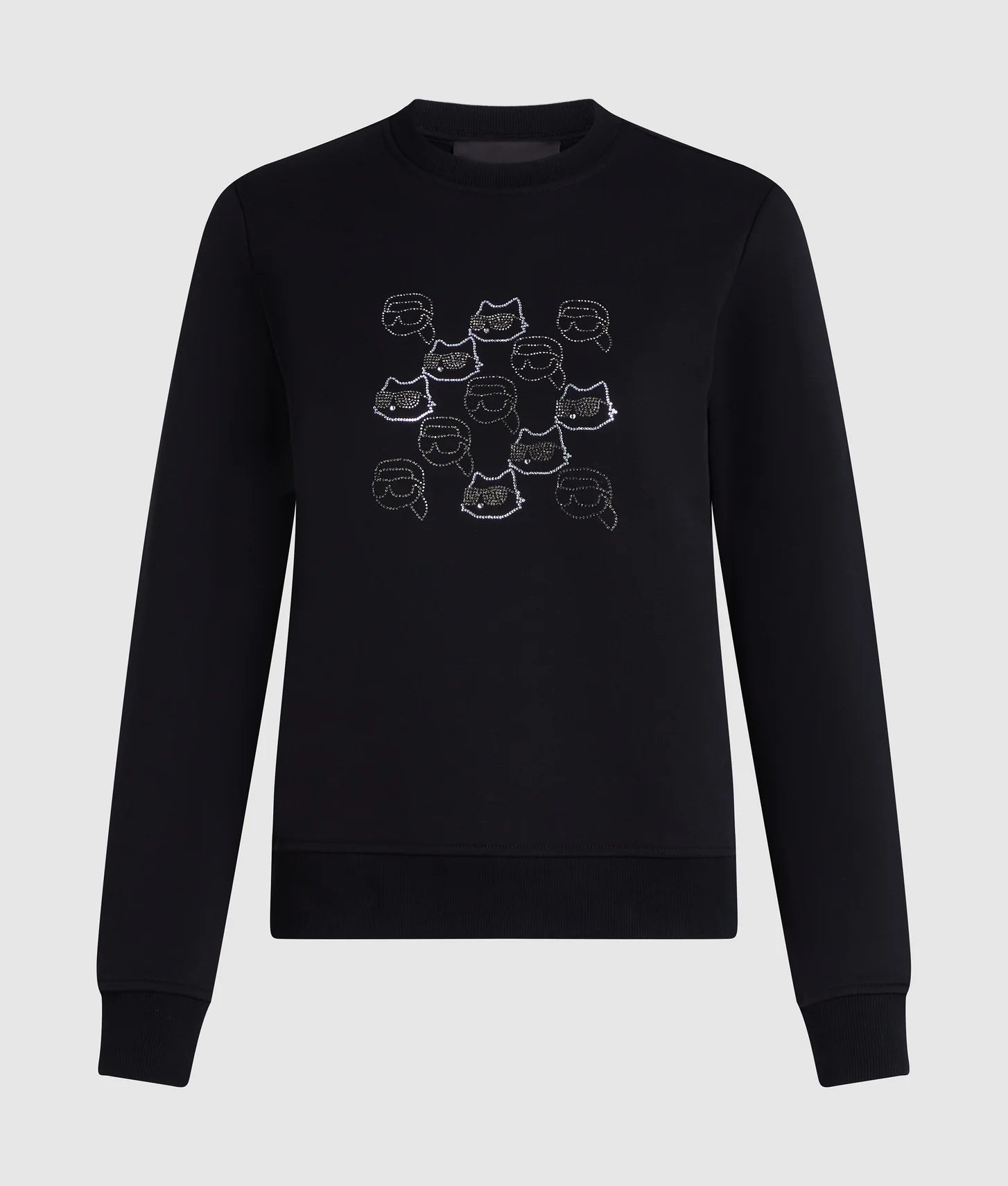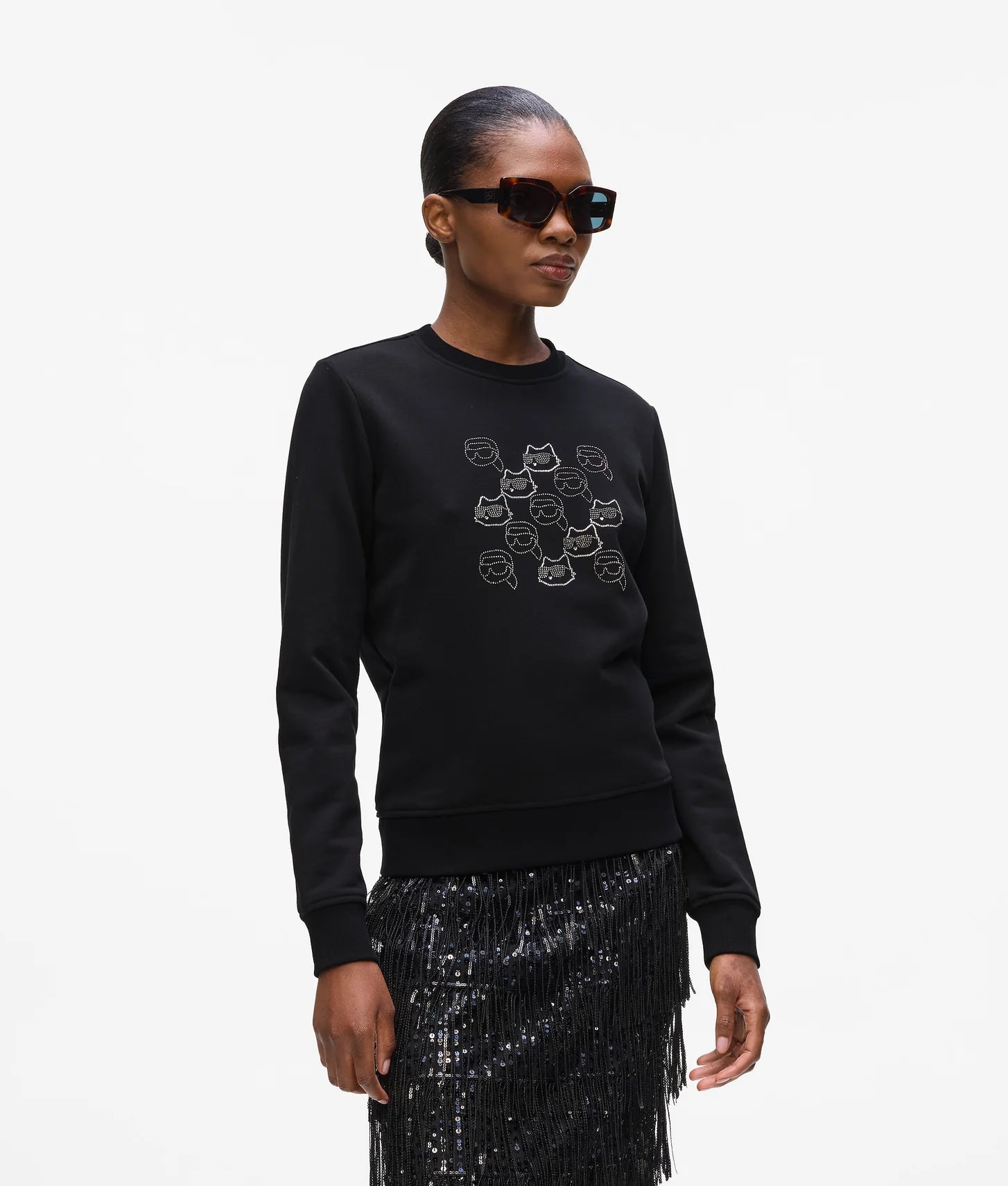 The classic crew-neck silhouette is complemented by light ribbing at the collar, sleeve cuffs, and hem, adding subtle texture and enhanced warmth while helping the sweatshirt retain its shape. The highlight of this piece is the rhinestone-embellished Ikon artwork at the front, creating a playful yet elegant sparkle that elevates a casual staple into a chic, eye-catching look.