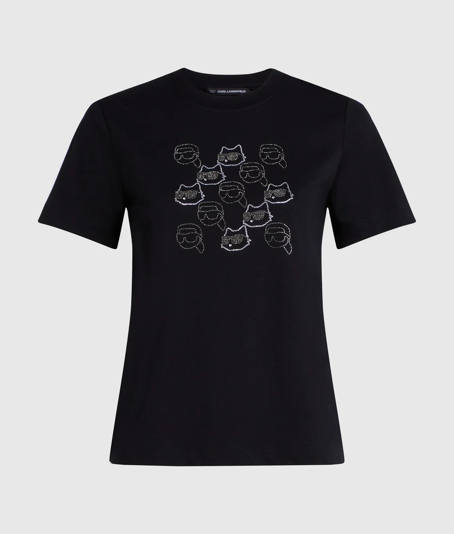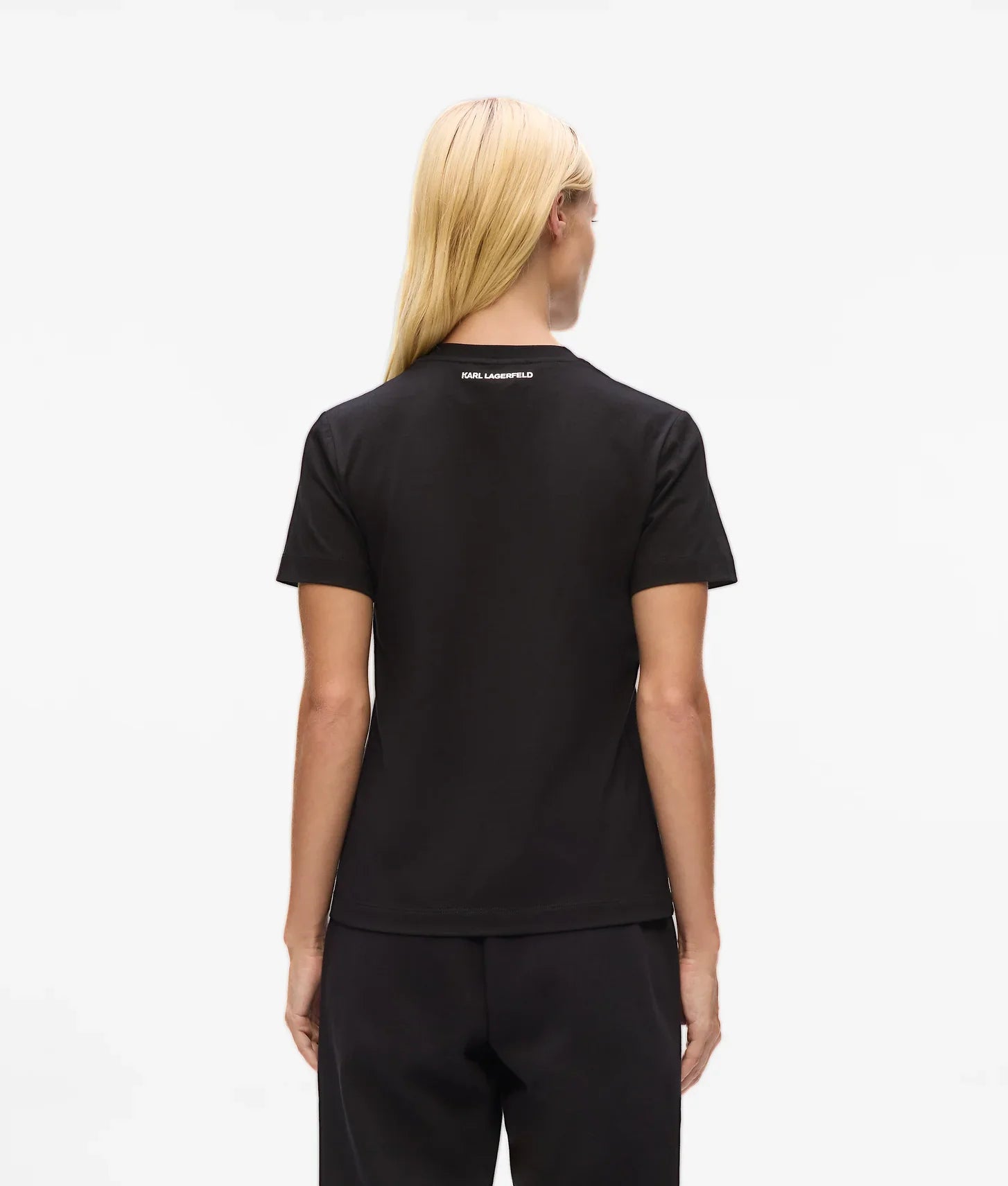 Designed with a classic crew neck and short sleeves, it maintains a timeless silhouette while offering effortless wearability. The standout feature is the rhinestone-embellished Ikon artwork at the front, which adds sparkling detail and a playful, contemporary flair to your casual wardrobe. A subtle logo detail at the back reinforces the signature KARL LAGERFELD branding, ensuring the T-shirt is both stylish and recognizable.