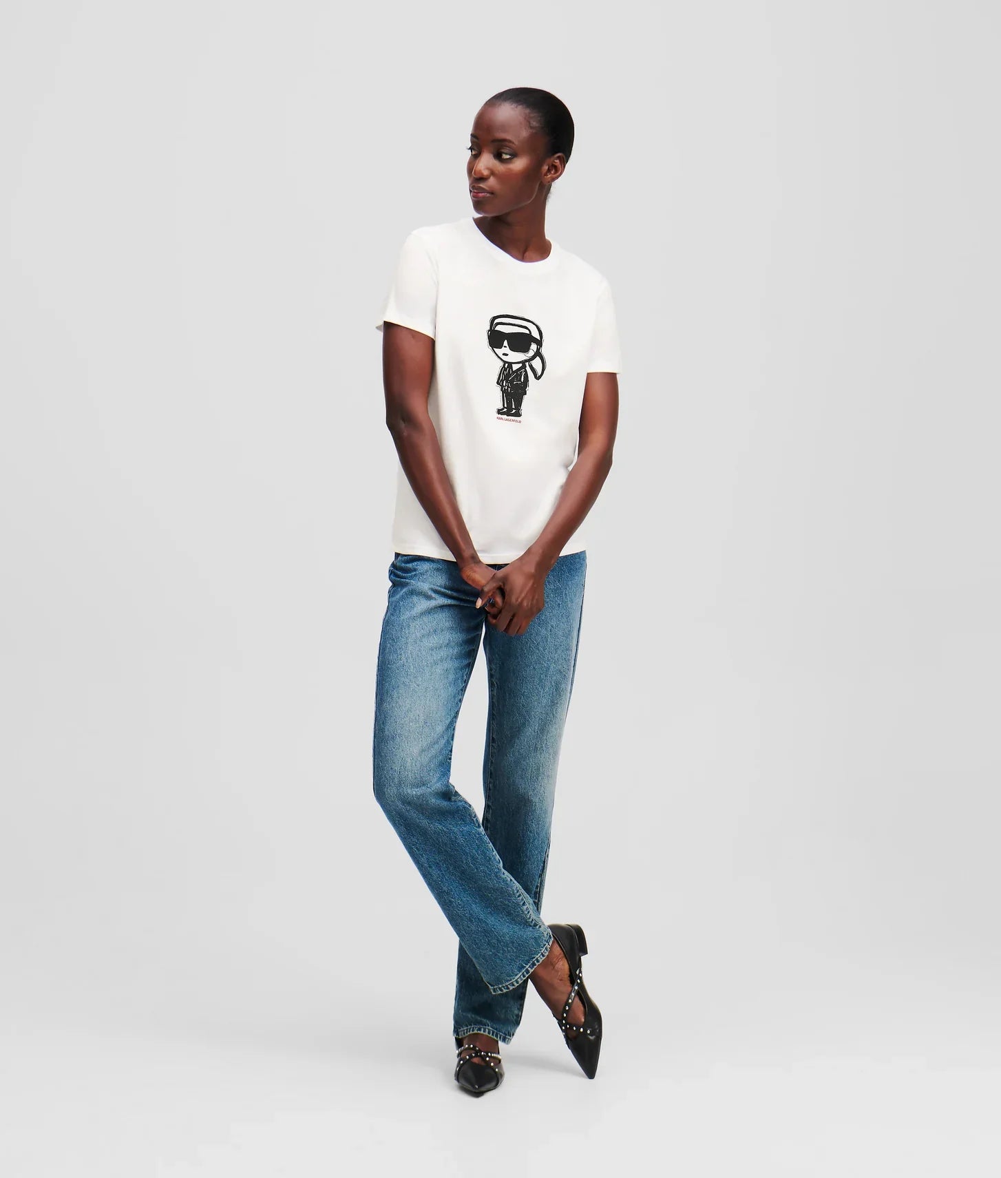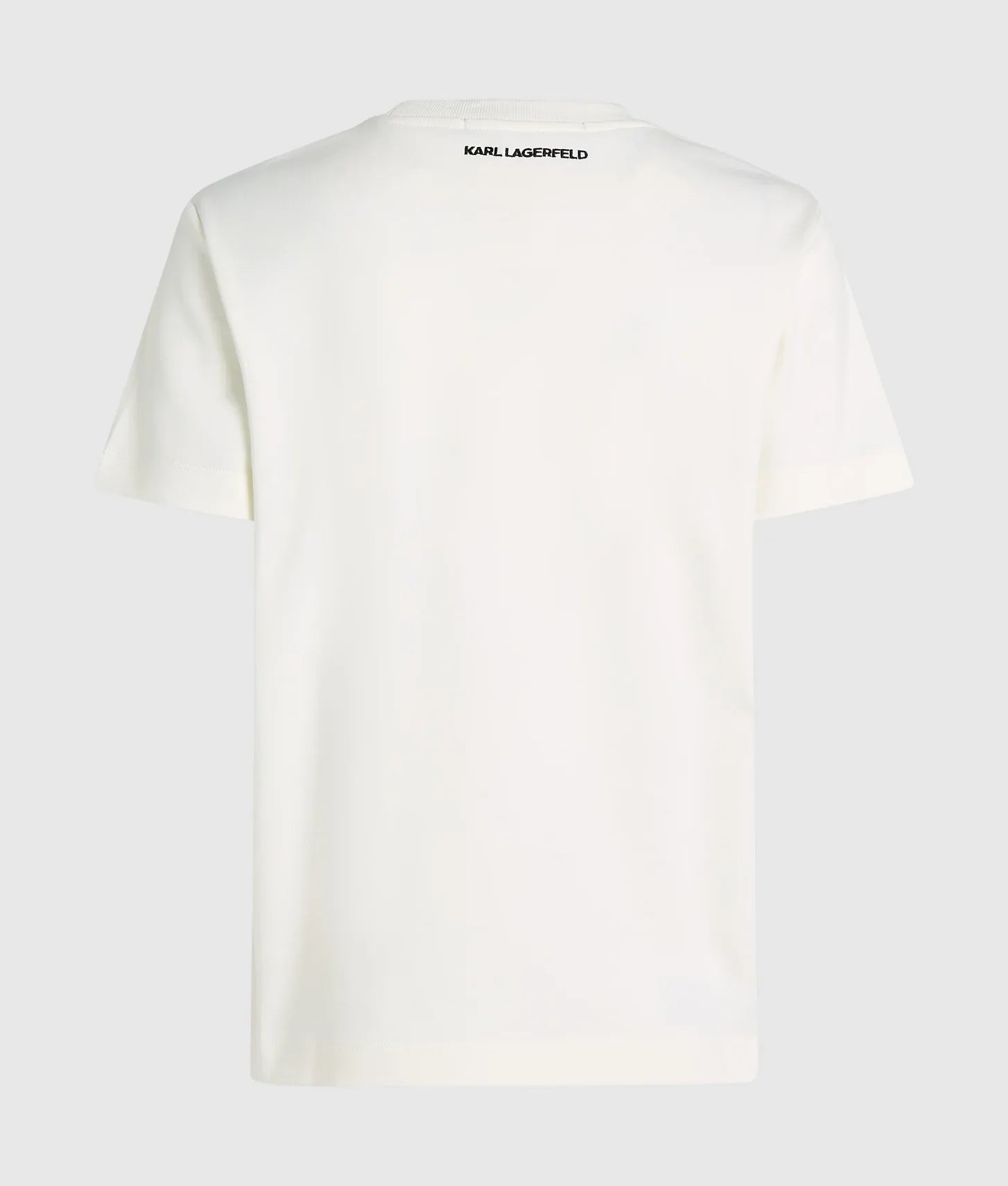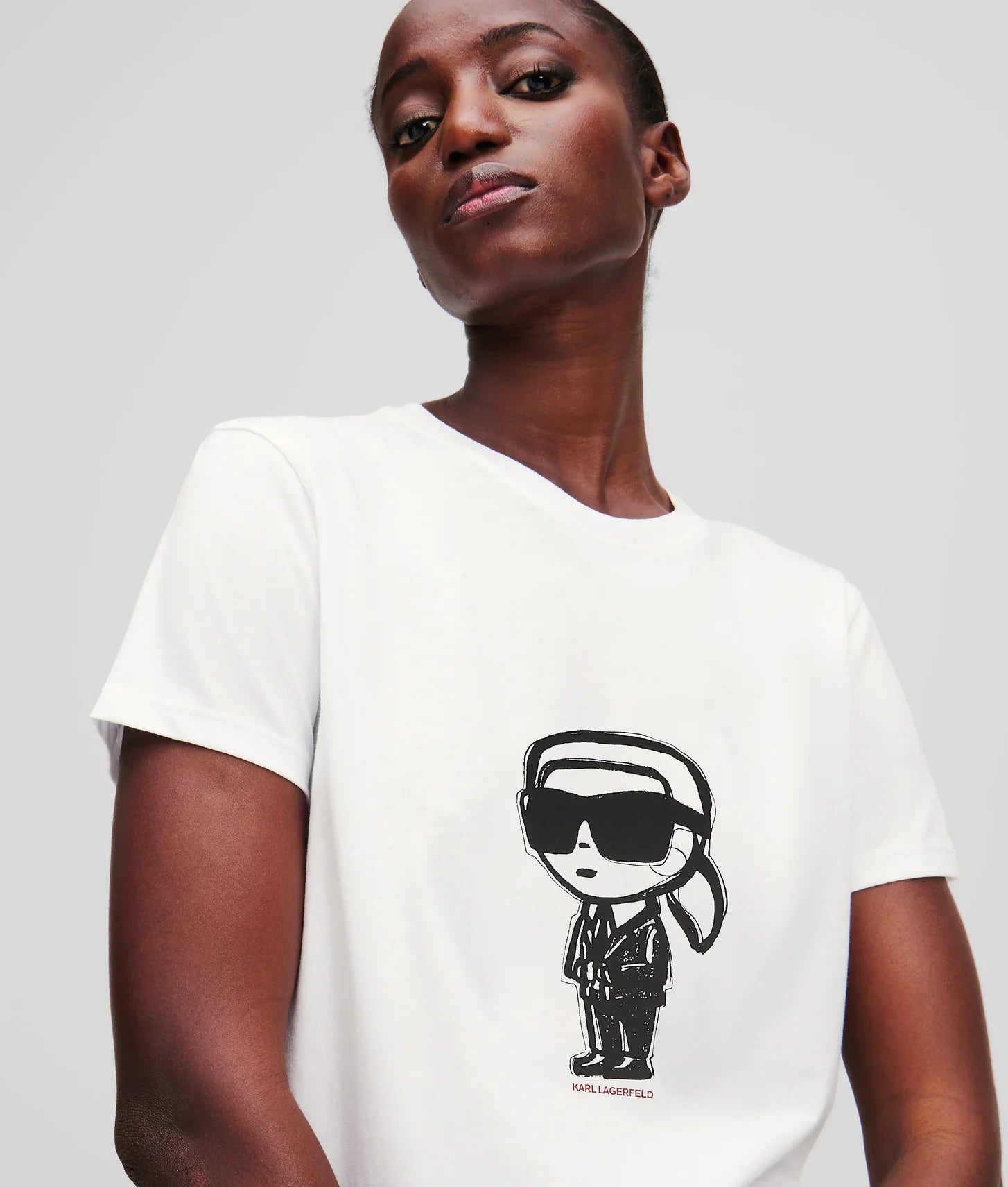 The classic crew-neck silhouette and short sleeves create a timeless foundation, while the sketched IKON Karl artwork at the front adds a creative, hand-drawn edge that elevates the look. A contrasting KARL LAGERFELD logo at the back neck delivers a subtle branded finish, ensuring impact from every angle.