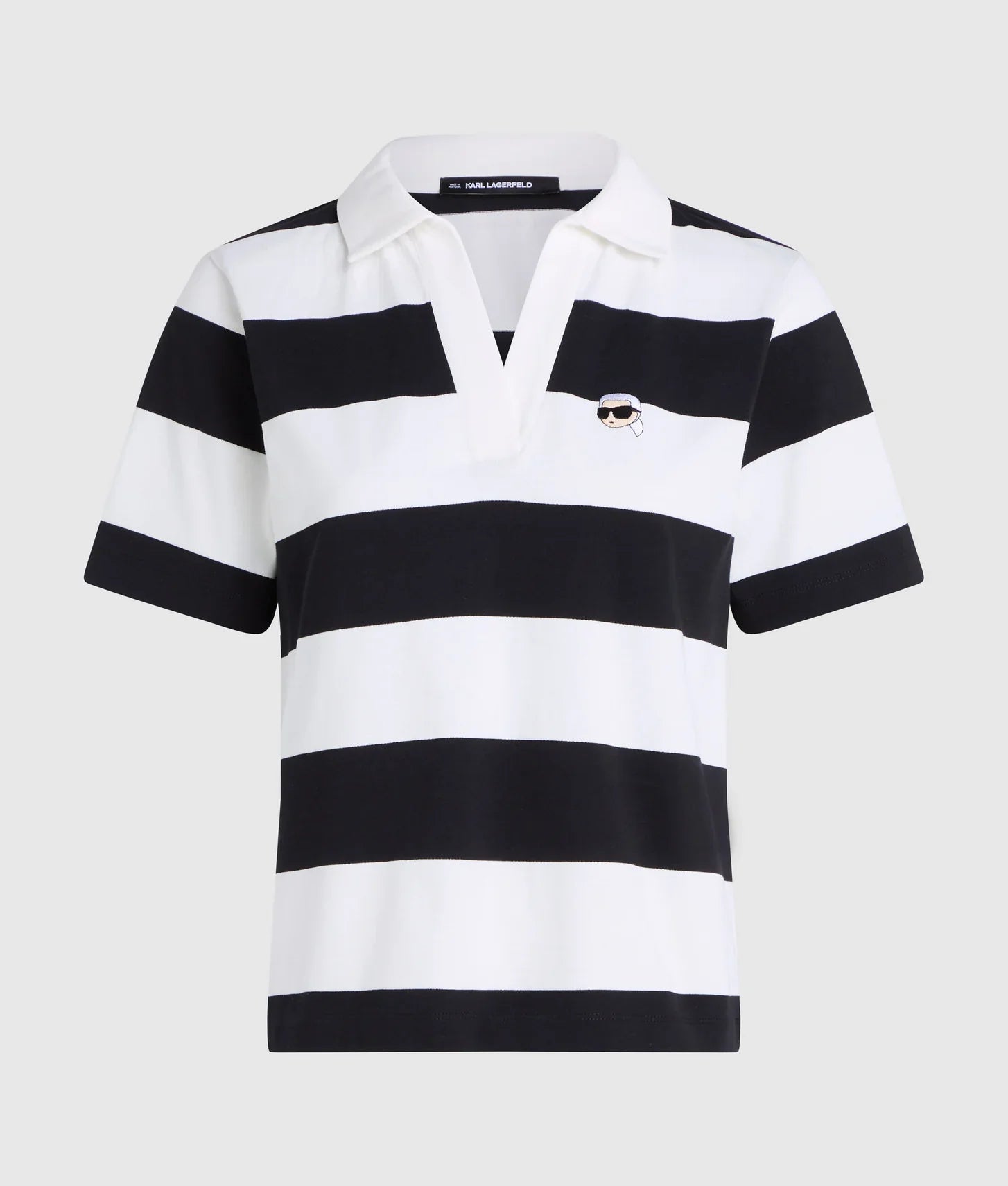 The shirt features a preppy pointed collar with an open placket, lending a refined yet effortless vibe. Short sleeves keep the design versatile and perfect for warm-weather wear or layering under jackets. The bold striped pattern adds visual interest, while the Ikon Karl patch at the left chest provides a playful signature detail that elevates the classic polo with a modern edge.