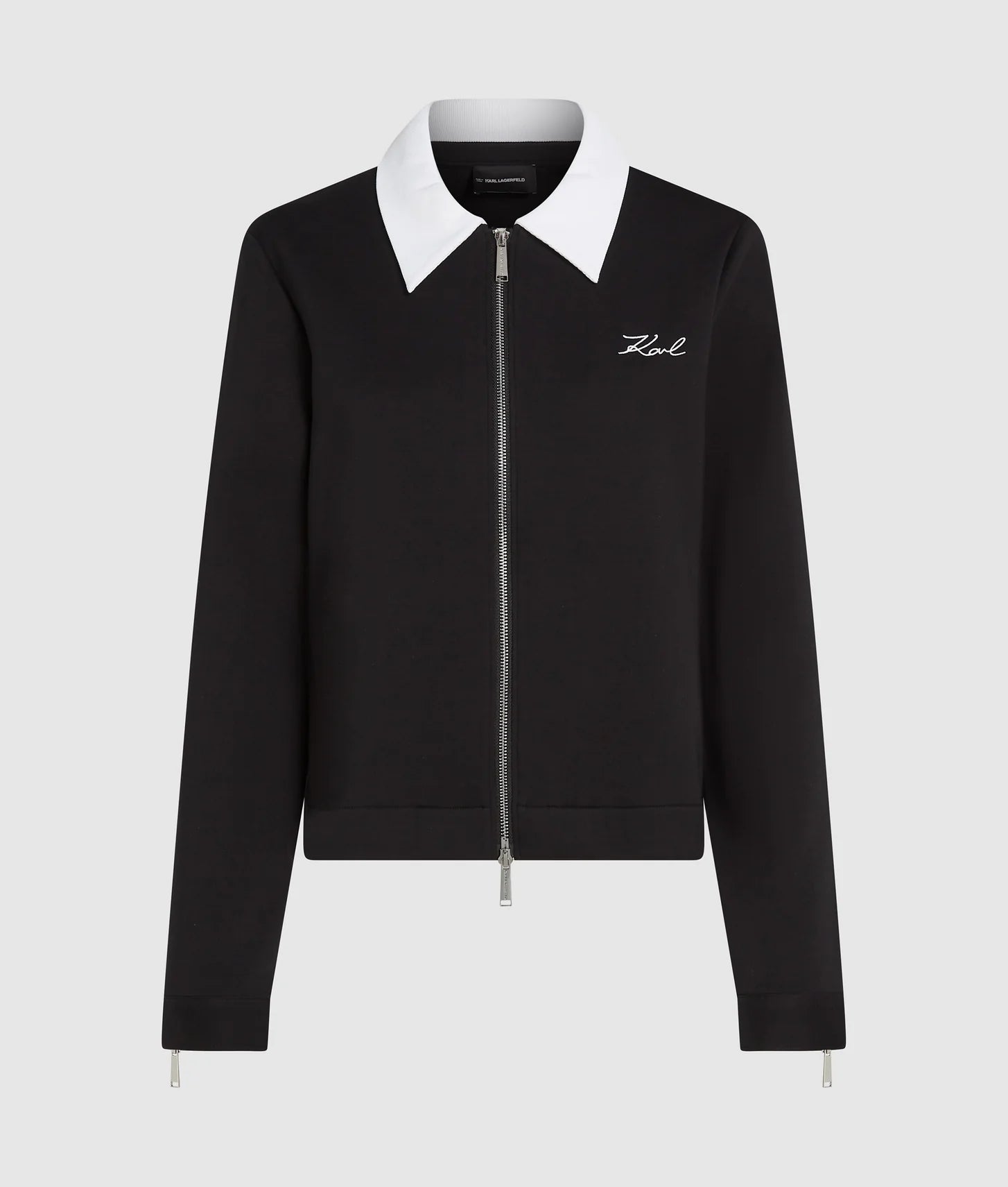The design features a contrasting pointed collar that adds a crisp, elevated edge, while the two-way zipper at the center front allows for versatile styling and easy layering. Whether worn fully zipped for a clean, streamlined look or partially open over a tee, this sweatshirt adapts effortlessly to different occasions. Welt pockets enhance the minimalist aesthetic while providing practical storage, and zipped sleeve cuffs with contrasting hems introduce a refined, contemporary finish.
