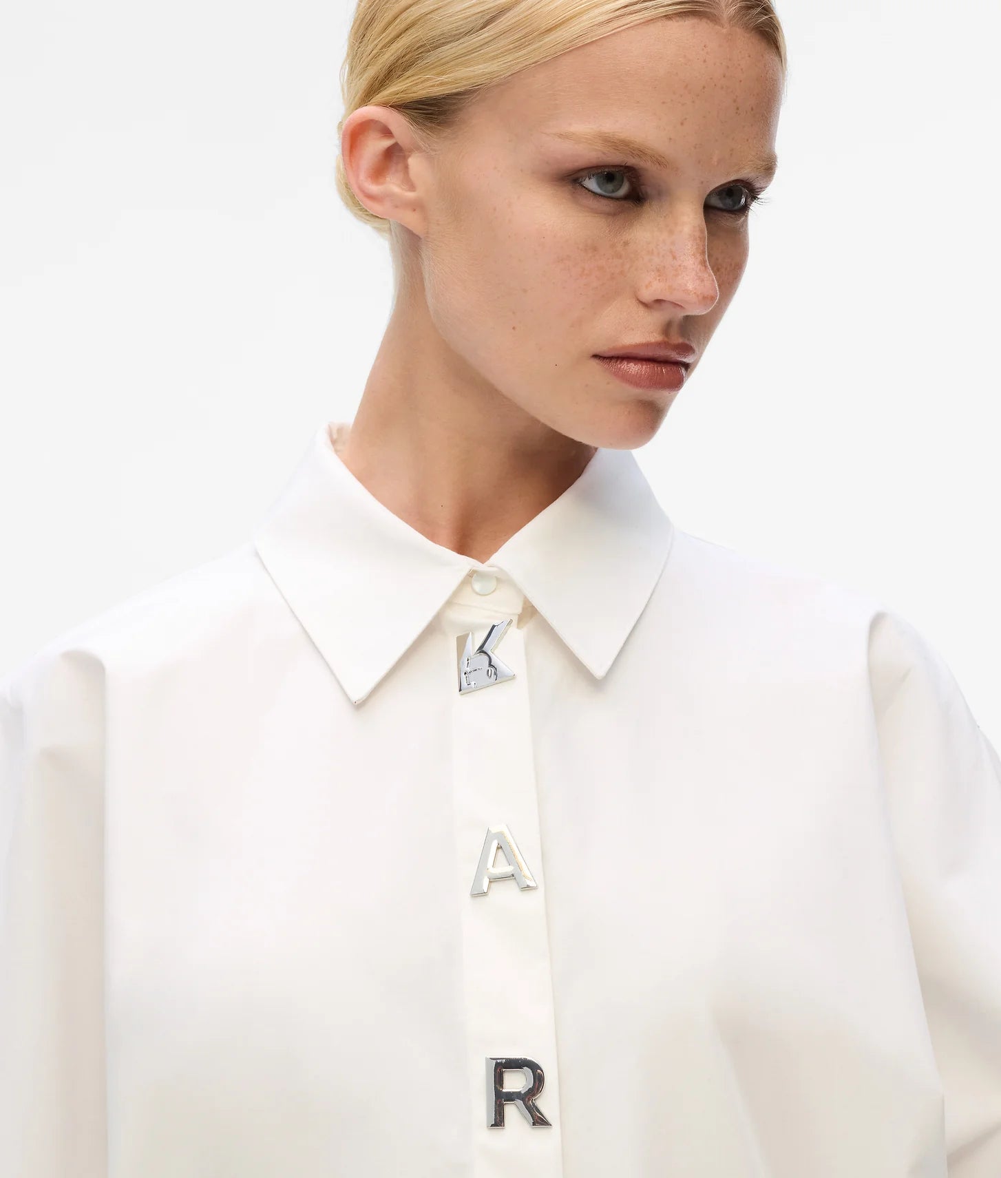 The structured silhouette is elevated by striking KARL letter embellishments that run down the front placket, creating a signature focal point. A classic pointed collar and snap button closure offer refined detailing while ensuring ease of wear. Subtle tonal Signature logo embroidery at the left sleeve cuff adds an understated designer accent, enhancing the shirt’s luxe appeal.