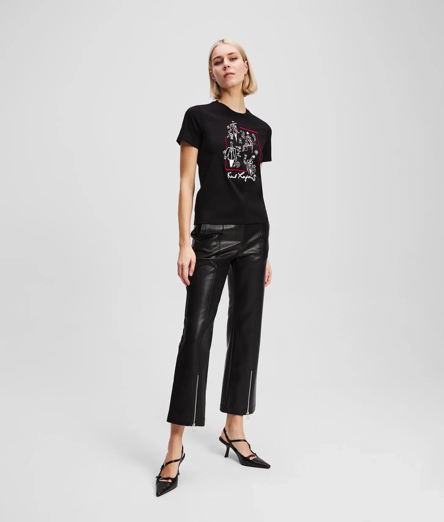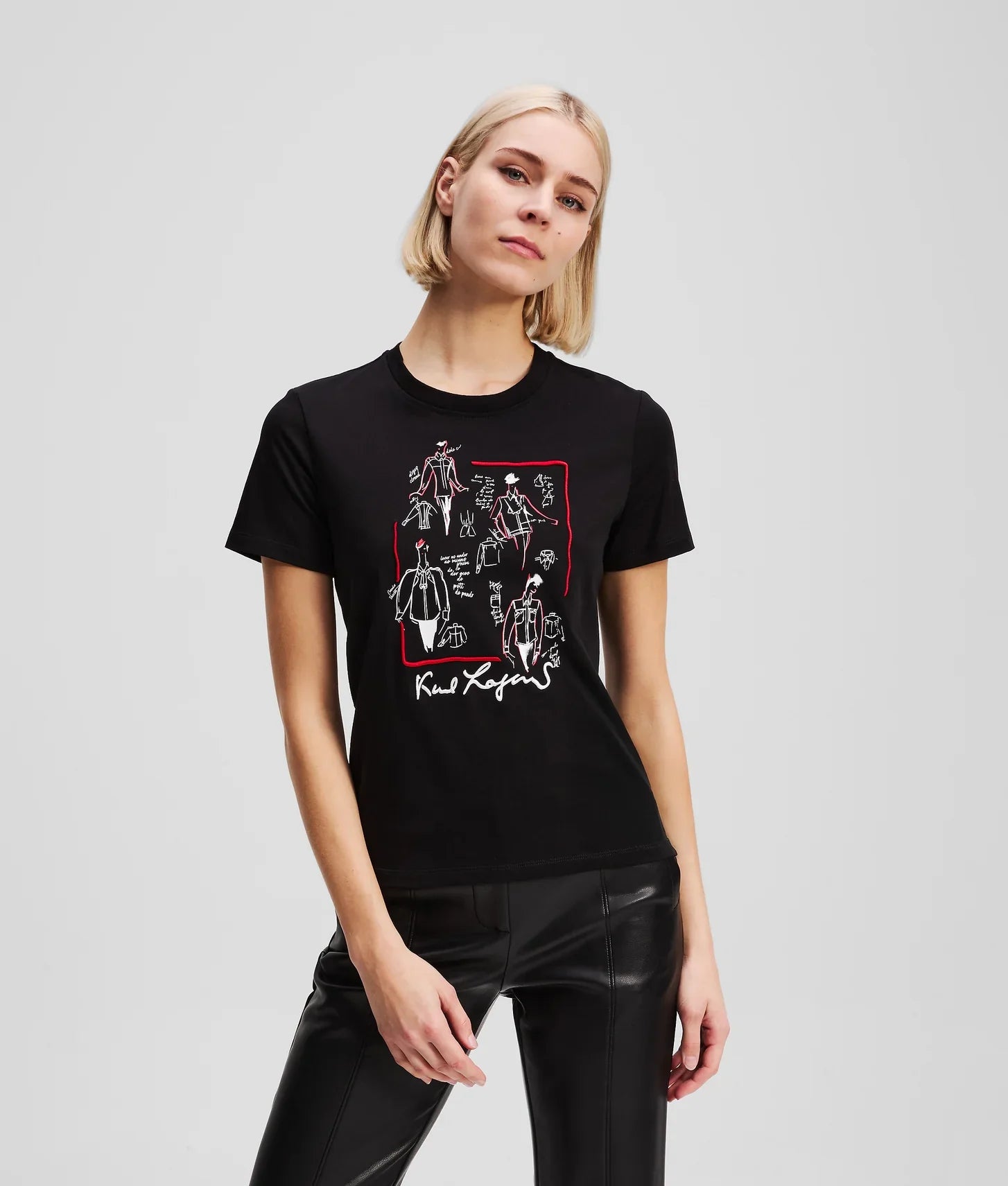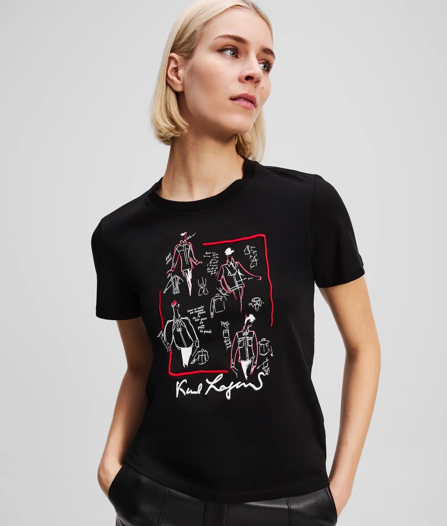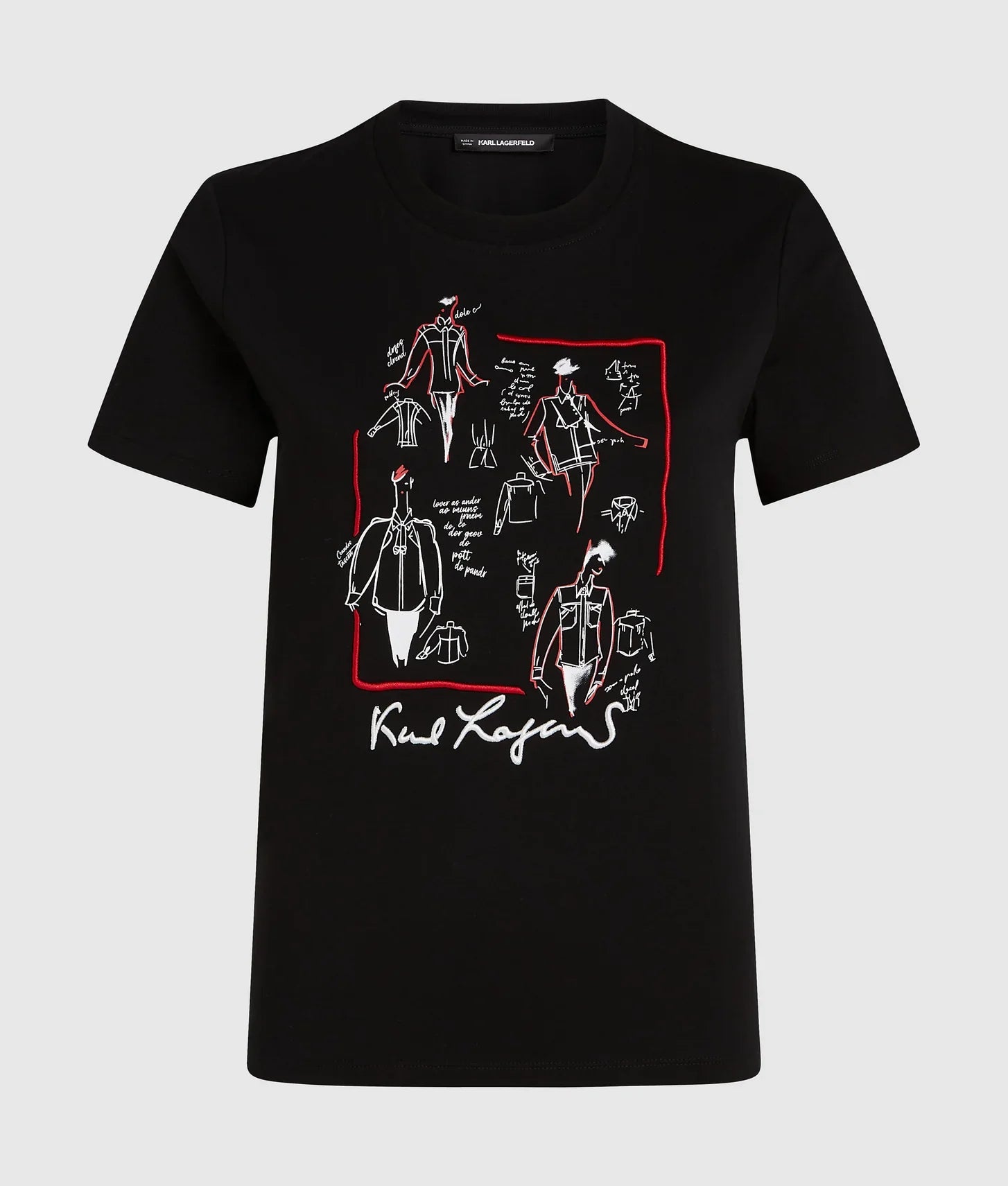 Crafted from 100% organic cotton jersey, the fabric feels soft and breathable against the skin while offering durability for everyday wear. The front is brought to life with striking artwork inspired by original sketches from Karl Lagerfeld’s iconic archive, turning the T-shirt into a wearable canvas that celebrates the designer’s unmistakable vision. A minimalist KARL LAGERFELD logo at the back hem adds a refined, understated brand signature.