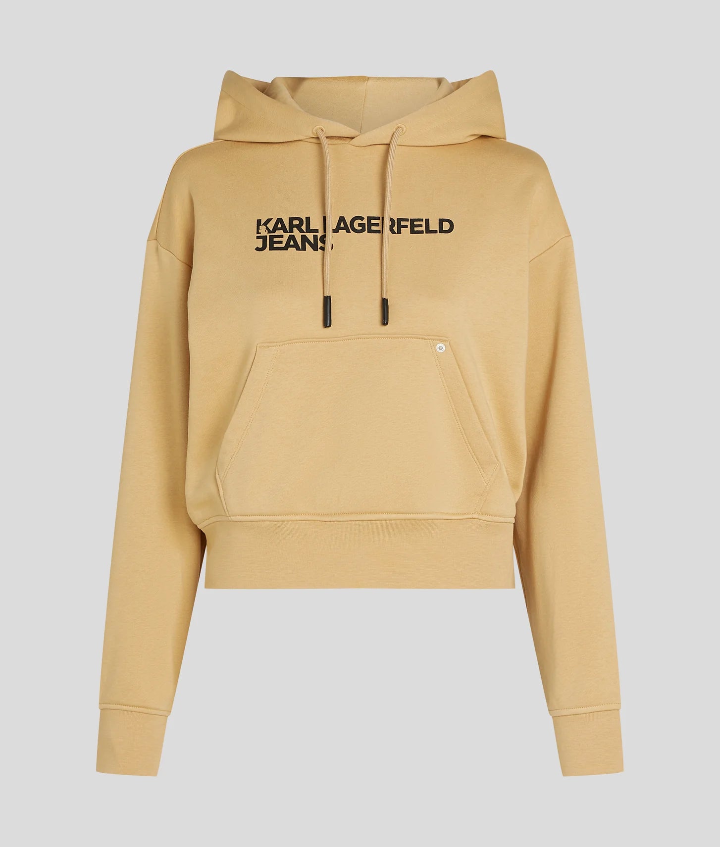 Designed with practicality in mind, the hoodie features a drawcord-adjustable hood for customizable coverage and a spacious kangaroo pocket for convenience and a timeless casual silhouette. Light ribbing at the sleeve cuffs and hem provides a secure fit while maintaining shape over time. The bold KARL LAGERFELD JEANS logo prominently displayed at the chest delivers a striking, designer-ready statement that elevates a casual staple into a fashion-forward piece.