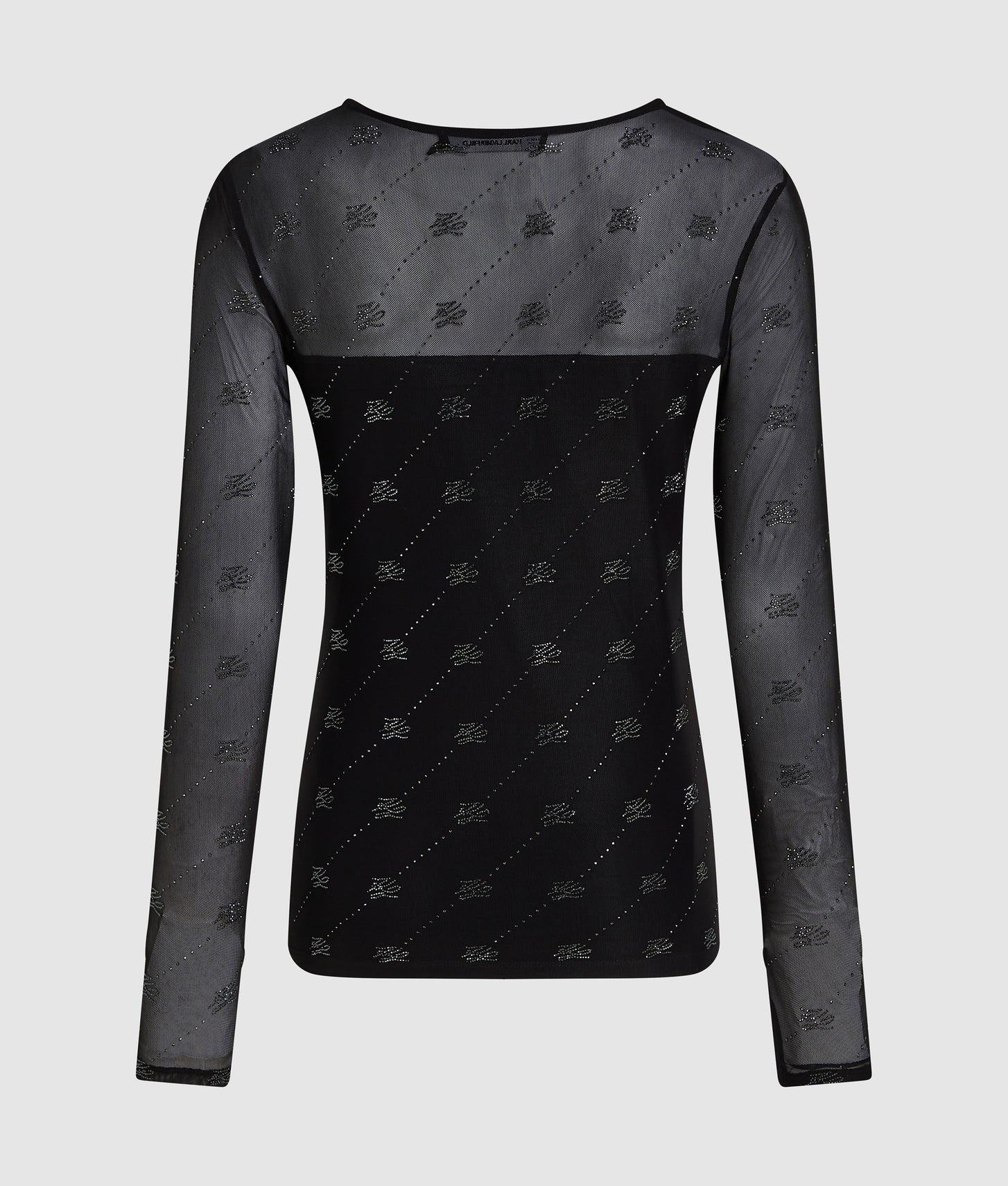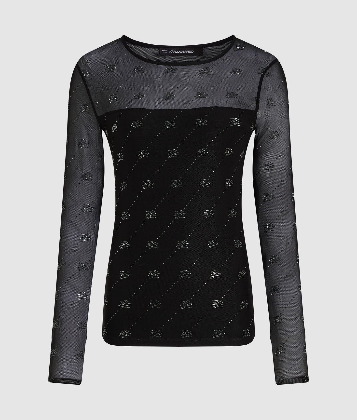 The standout feature is the all-over Karl Autograph logo embellished in sparkling rhinestones, which catches the light with every movement, adding a luxurious, eye-catching shimmer. Its sleek silhouette allows it to be effortlessly tucked into tailored trousers for a polished look or paired with a leather mini skirt for a bold, edgy evening outfit.