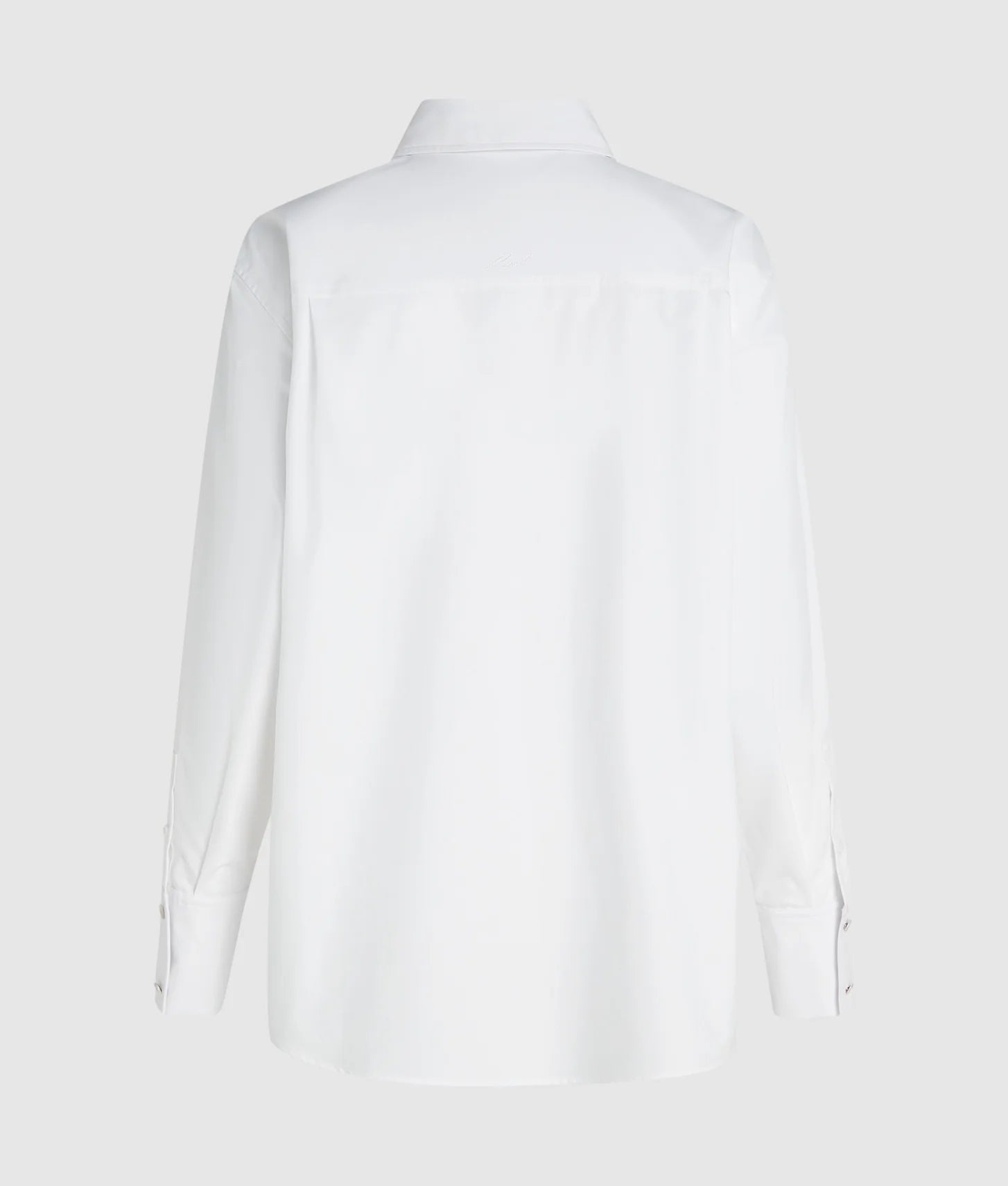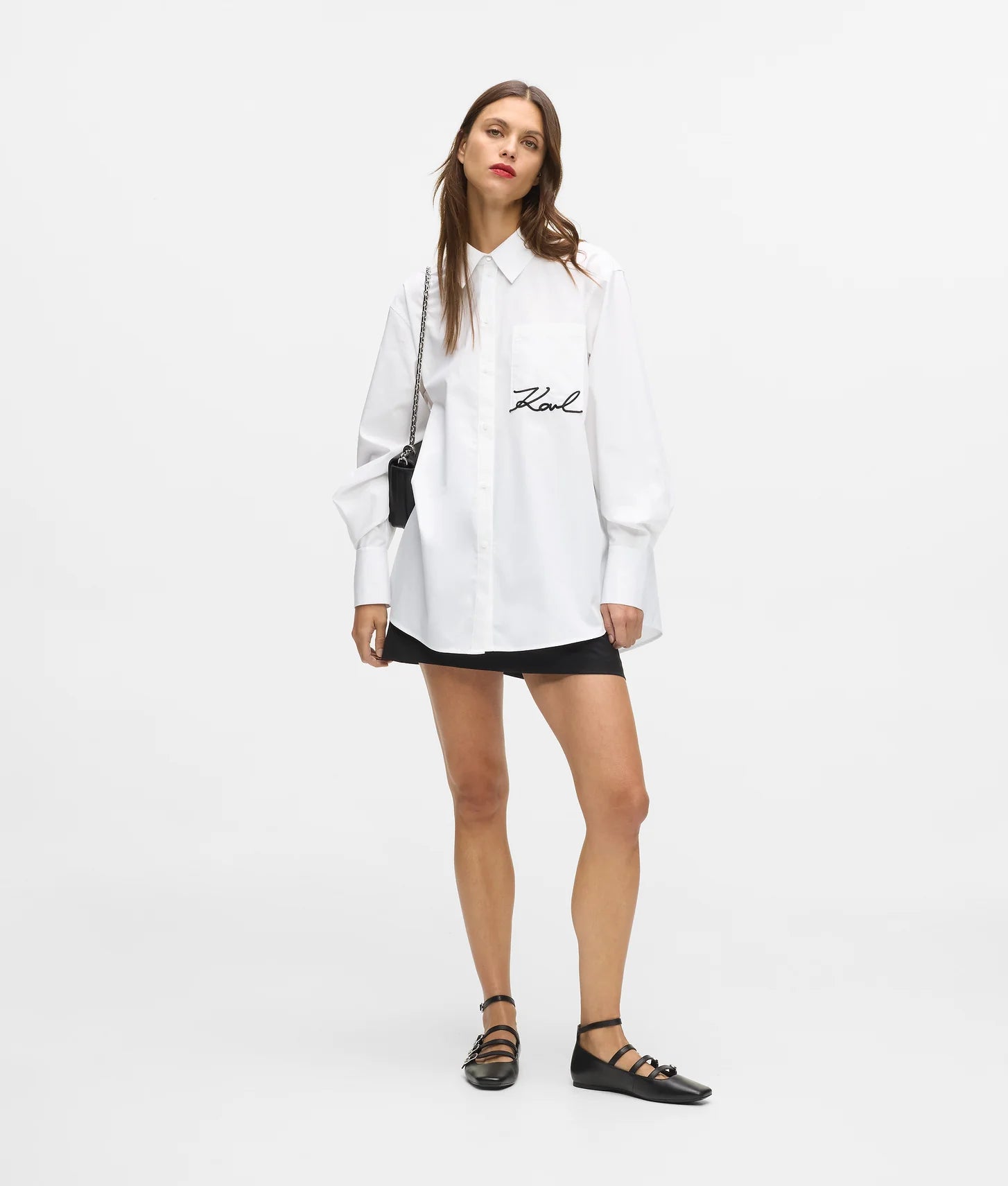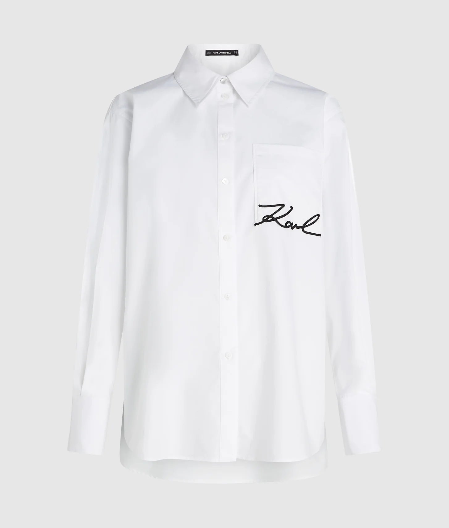 Refined simplicity meets iconic detailing in the Signature Pocket Shirt from KARL LAGERFELD. Crafted from crisp, breathable organic cotton, this timeless button-front shirt is designed to deliver effortless polish with a modern edge. Clean lines and a sharp pointed collar create a structured silhouette that transitions seamlessly from workwear to off-duty styling.