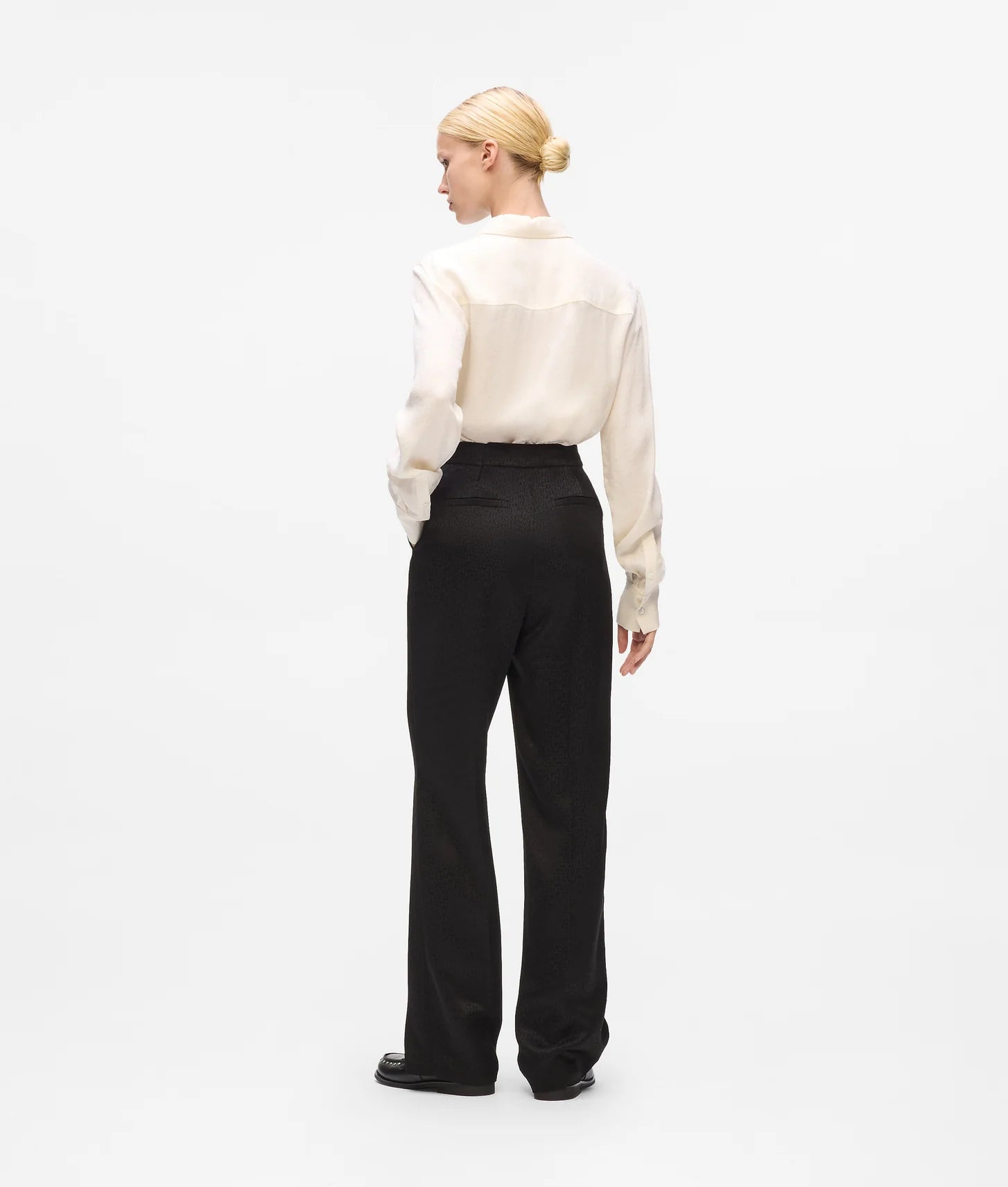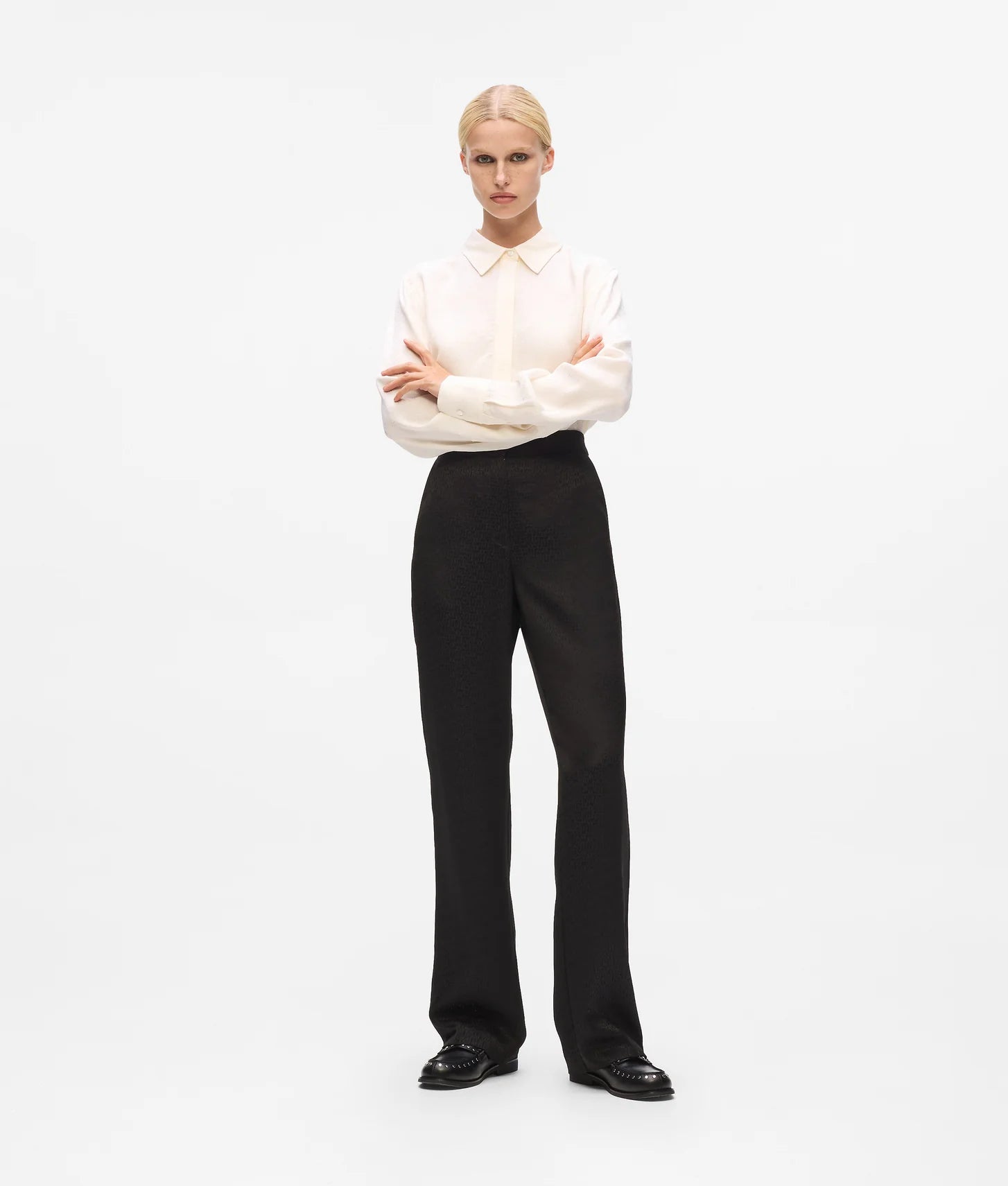 Crafted in a streamlined silhouette, the trousers offer a flattering fit that elongates the legs and maintains a sophisticated profile. The standout feature is the tonal all-over logo jacquard, which adds texture and visual interest without overpowering the design. A zip-fly closure ensures a clean, tailored finish at the waist, allowing the pants to sit seamlessly for a polished look.