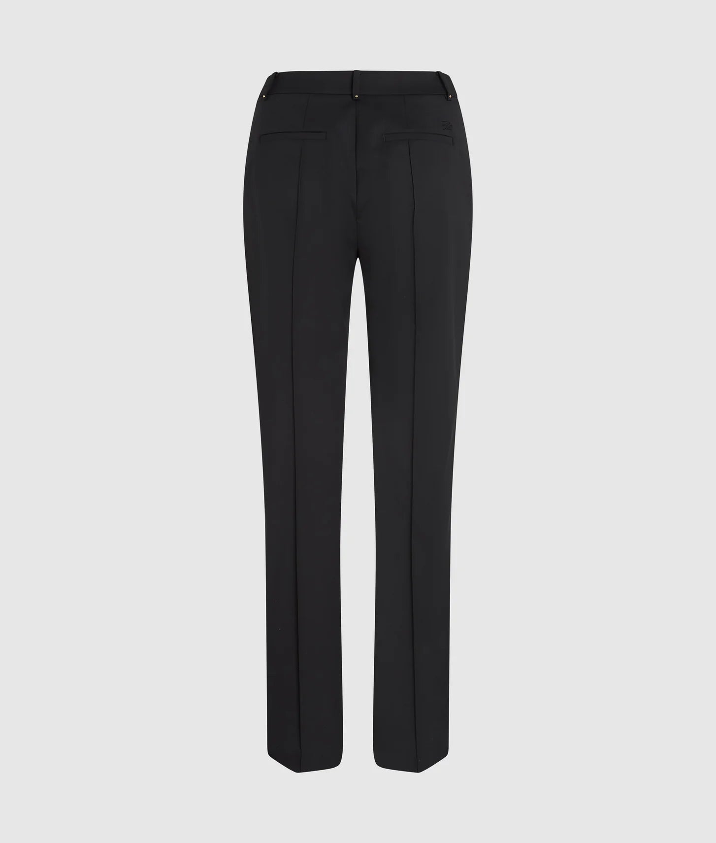 The design features a sleek, straight-leg silhouette that flatters the legs while maintaining a polished, professional appearance. A button and hook-and-eye closure ensures a secure, streamlined fit at the waist, while gold studs at the belt loops provide a touch of modern, designer-inspired detail, adding subtle attitude to a classic silhouette.