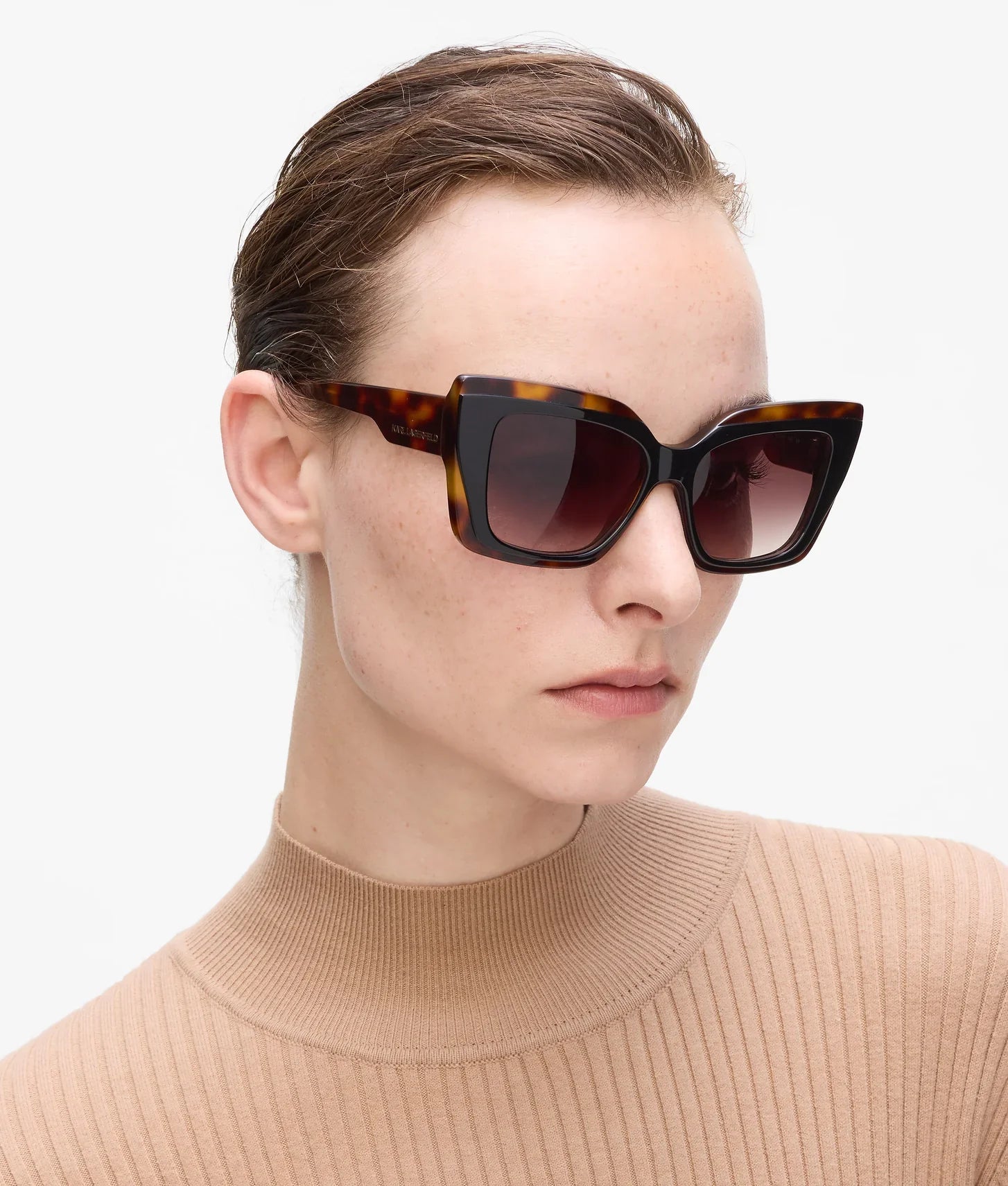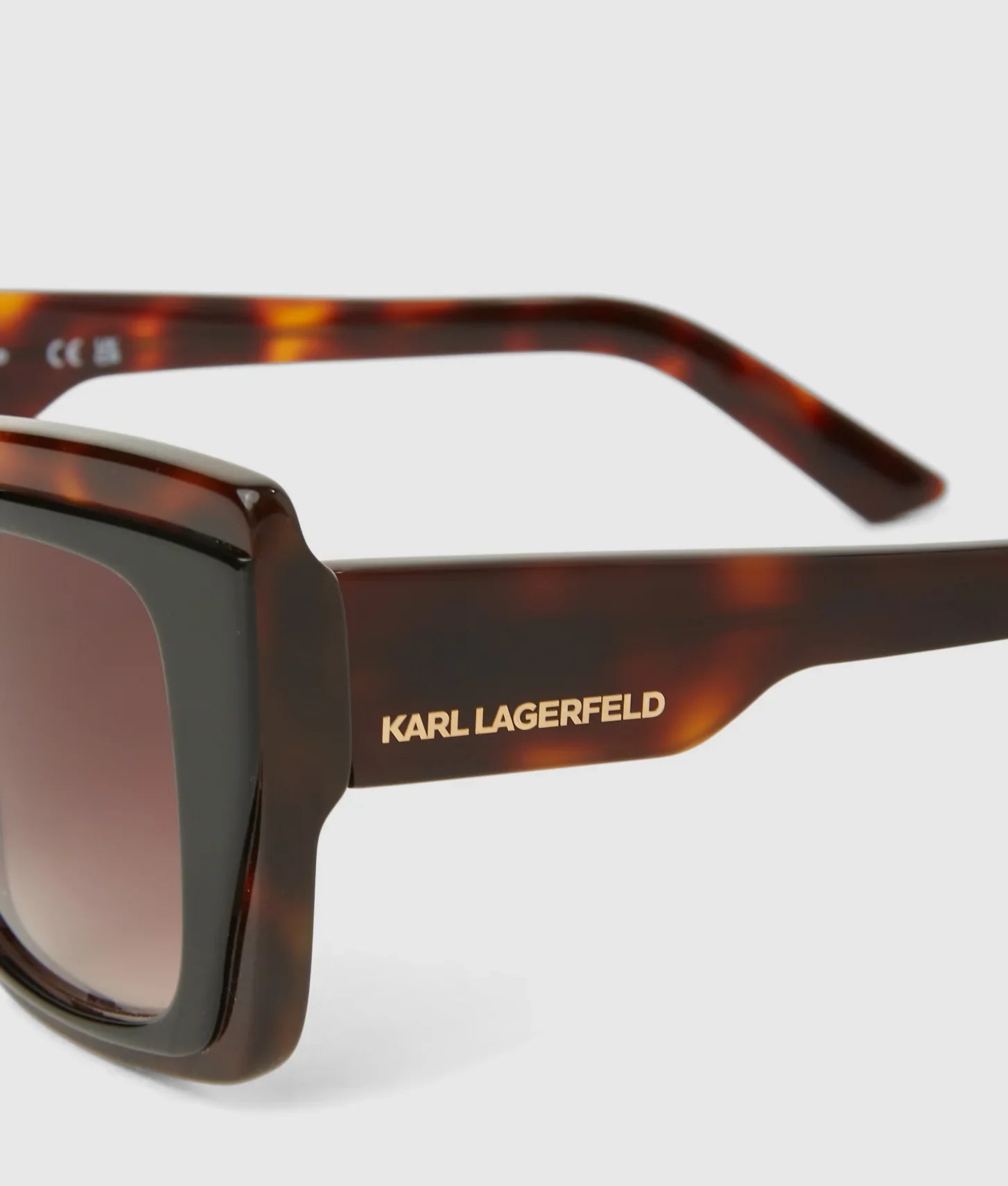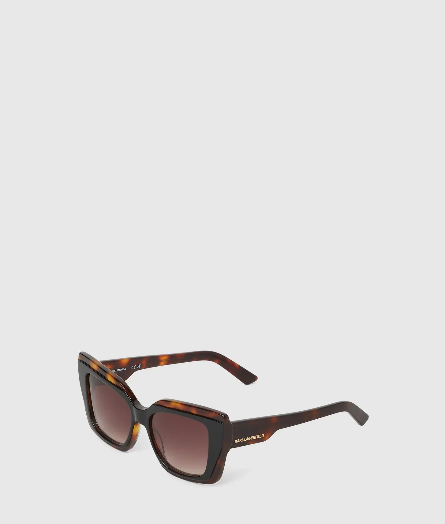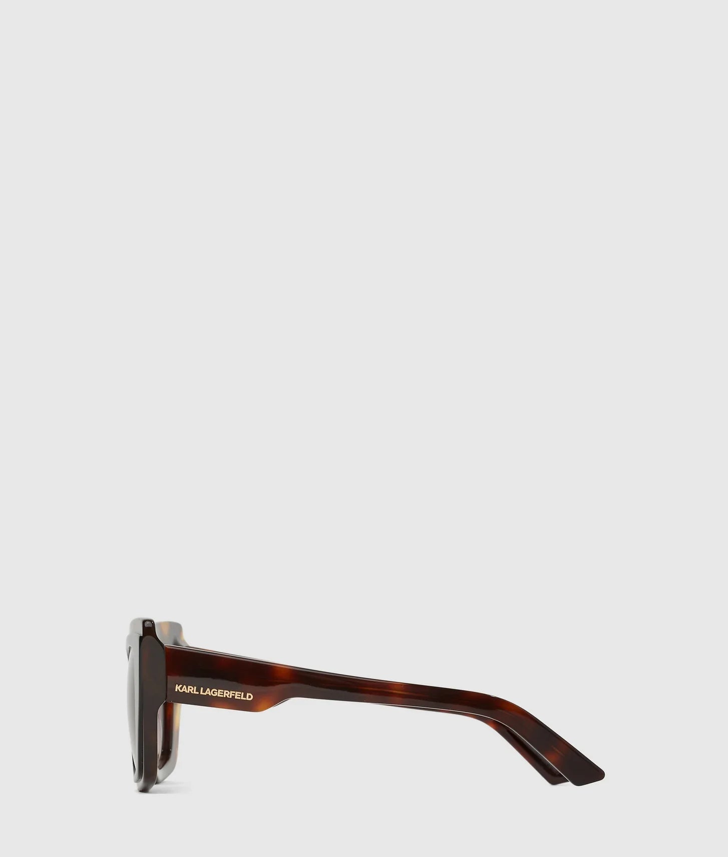The dark lenses offer both style and practical protection, shielding your eyes from sunlight while complementing the contemporary frame design. A molded nose stand ensures a secure and comfortable fit for all-day wear, making these sunglasses as wearable as they are fashionable. The deep arms are subtly embossed with the iconic KARL LAGERFELD logo, adding a refined designer touch.