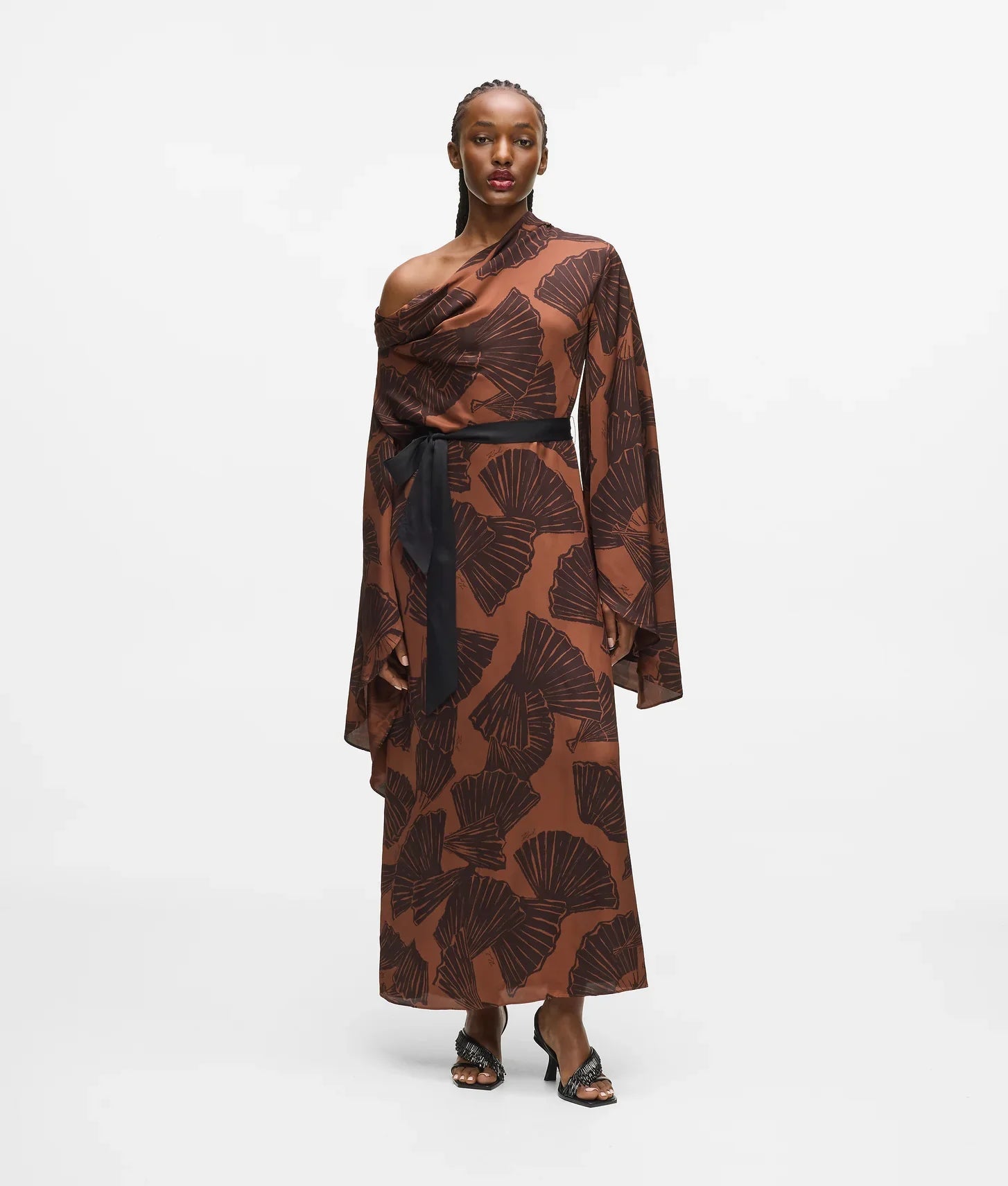 Inspired by Karl Lagerfeld's iconic fan motif, the dress is adorned with a seasonal all-over fan print, adding a playful yet refined visual element. The draped cowl neck creates a flattering neckline, while voluminous long sleeves provide a sense of drama and fluidity. The contrasting self-tie waistbelt, featuring embroidered Signature detailing, cinches the waist to define the silhouette and enhance the maxi dress’s flowing lines.
