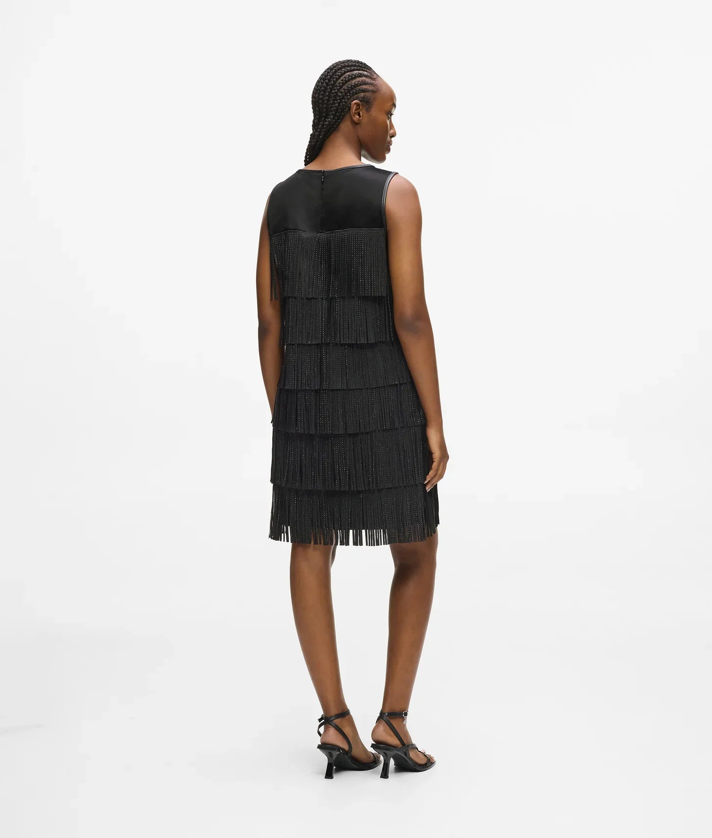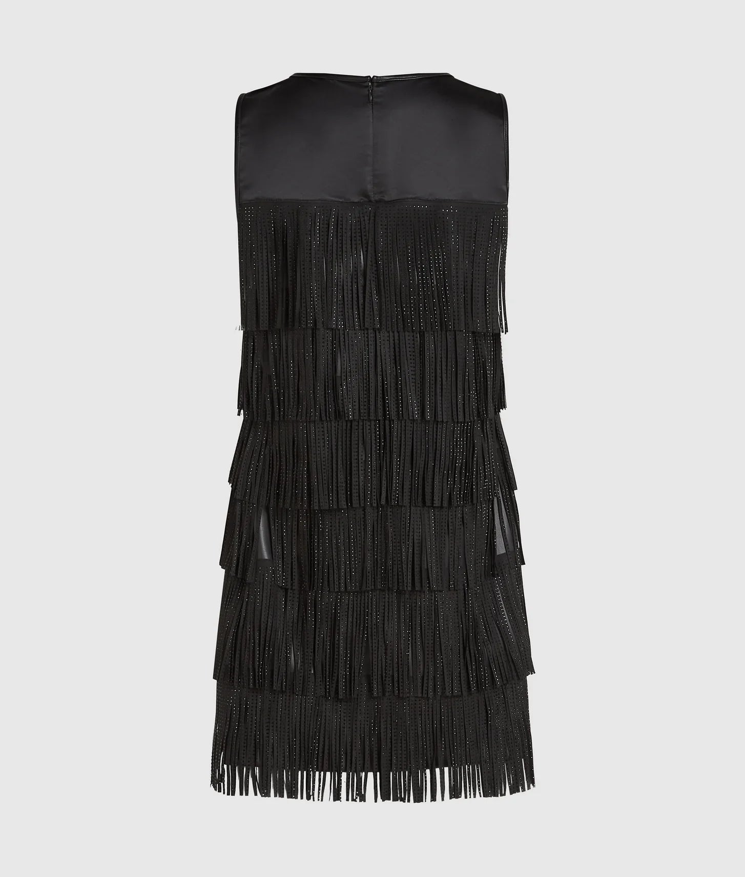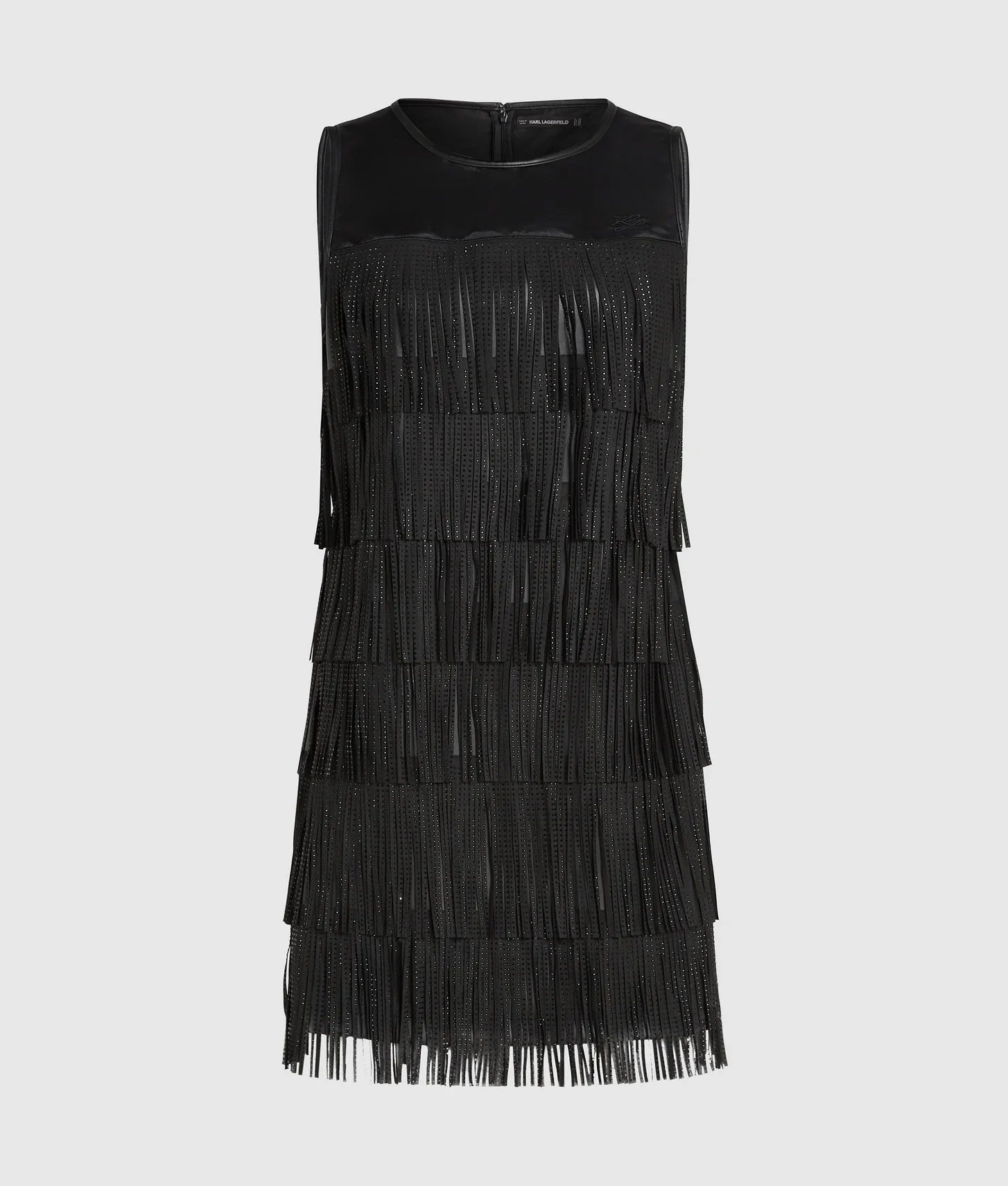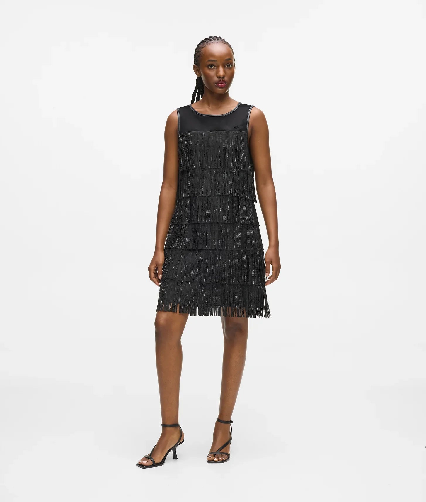 Step into effortless drama with the Faux Leather Fringe Dress, a sleeveless silhouette designed to captivate. Crafted from a blend of 50% polyester and 50% polyurethane, this dress combines satin panels with all-over faux-leather fringe, creating movement and texture that dances with every step. The playful fringe detailing gives the dress a dynamic, attention-grabbing appeal, perfect for evening events or standout party looks.