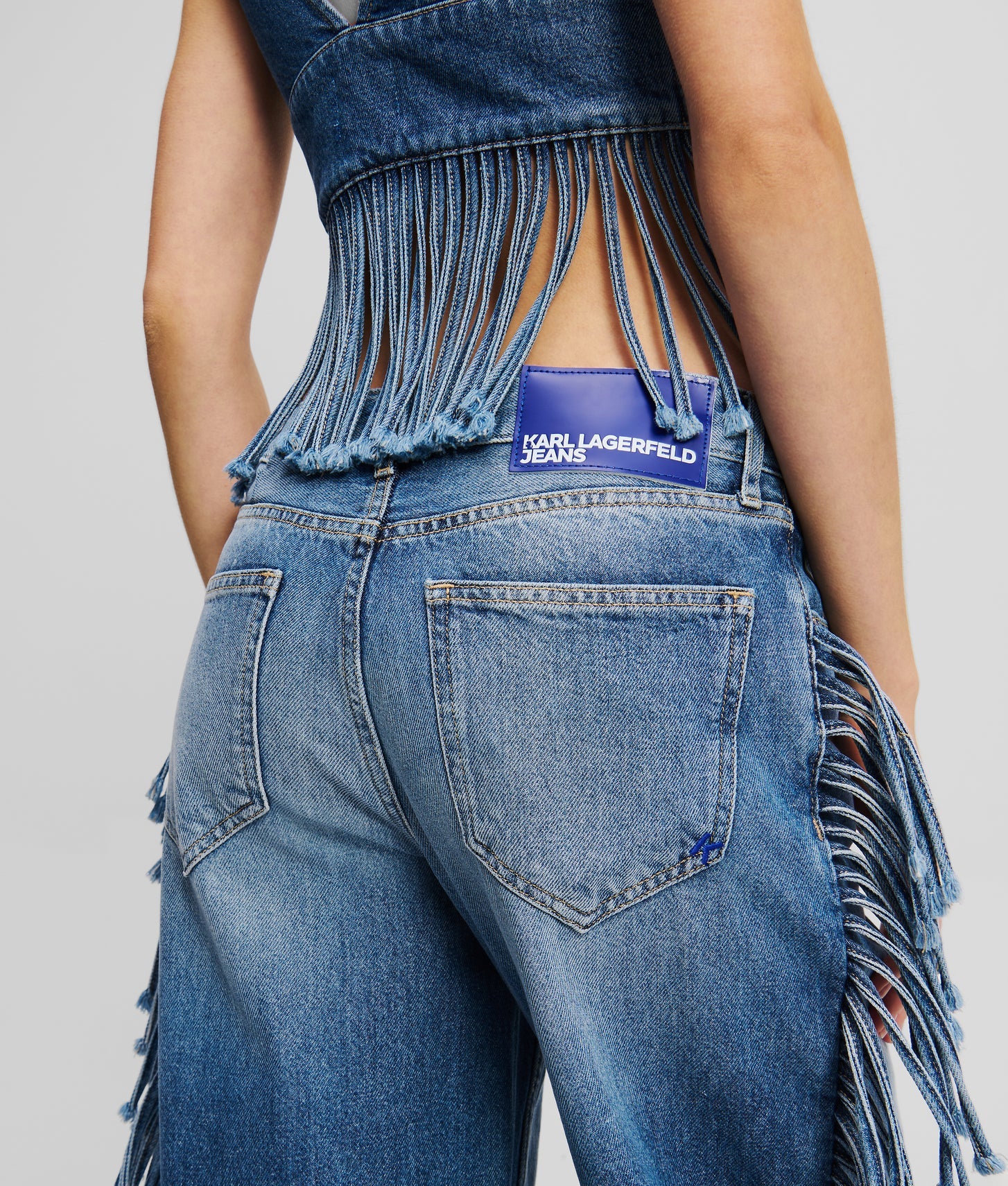 Signature KARL LAGERFELD JEANS details elevate the design, including a branded shank button at the fly closure and a leather logo patch at the back waistband. These refined elements balance the free-spirited fringe with a polished, designer finish.