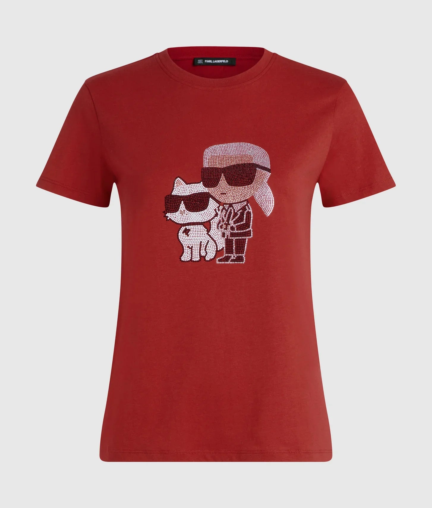 Rhinestone-embellished IKON Karl and Choupette artwork at the chest