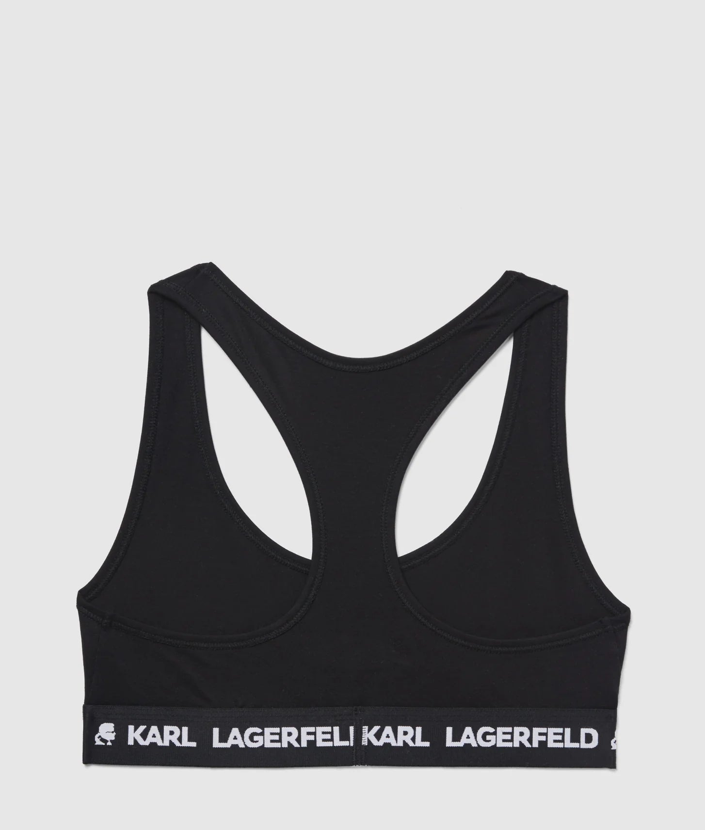 The non-wired design delivers low to medium support, making it ideal for relaxed wear, layering, or sporty styling. A branded elasticated chest band featuring the iconic KARL logo adds a statement touch while ensuring a secure, comfortable fit. The sleek racer-back silhouette allows for versatile styling under various tops or as a standalone piece for a contemporary, athletic-inspired look.